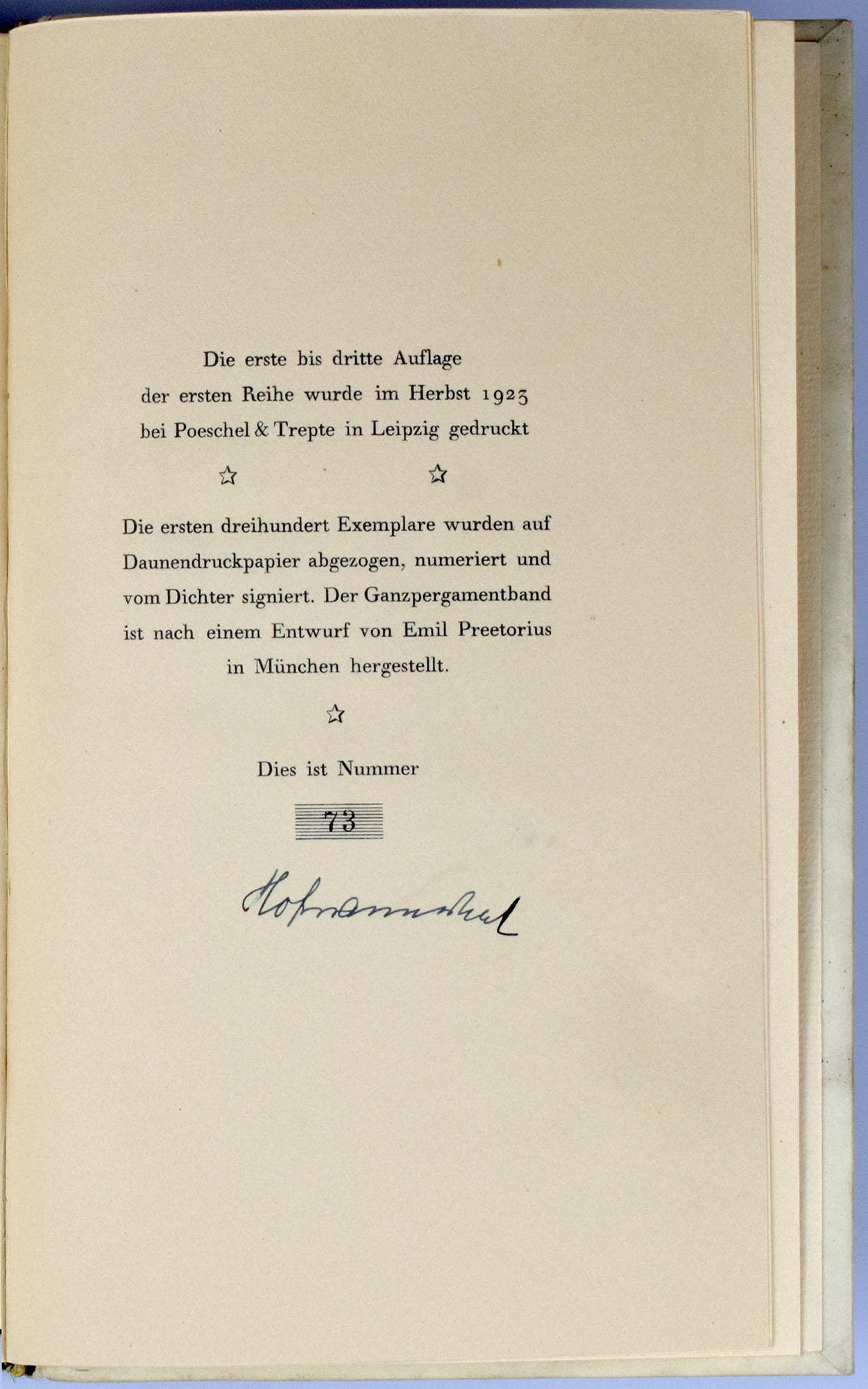 Nummer 73 von 300 Exemplaren der Vorzugsausgabe, im Kolophon in Tinte von Hofmannsthal signiert (Kolophon jeweils nur am Ende der beiden Reihen, also in Band 3 und in Band 6). Wilpert/Gühring 96. The Hoffmannsthal Collection in the Houghton Library 340. Auf Daunendruckpapier abgezogen. Die Einbände sind nach einem Entwurf von Emil Preetorius in München hergestellt worden.
