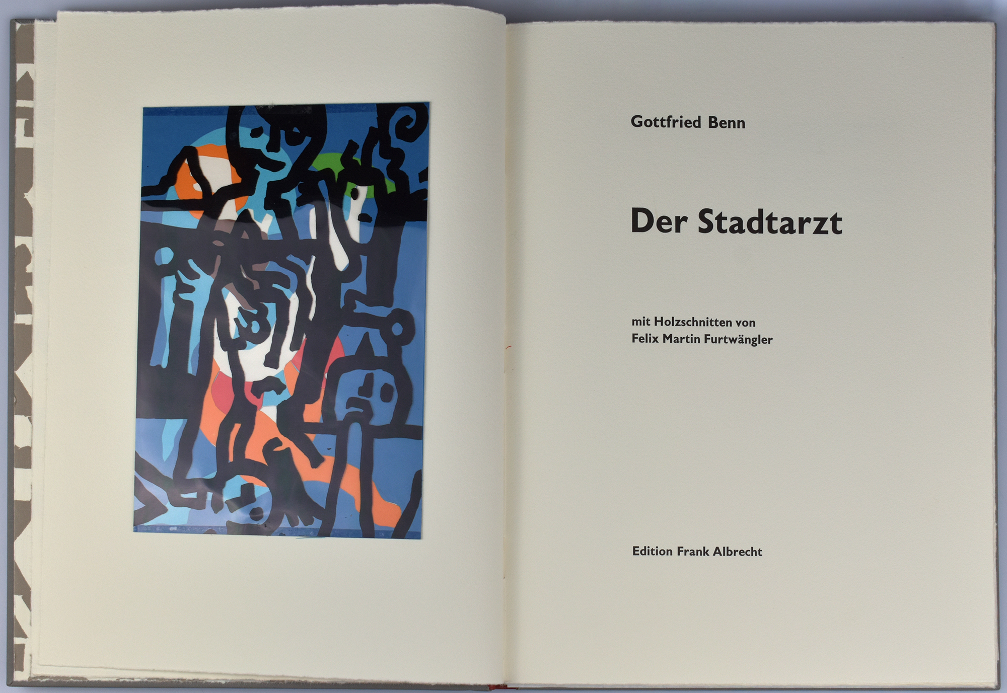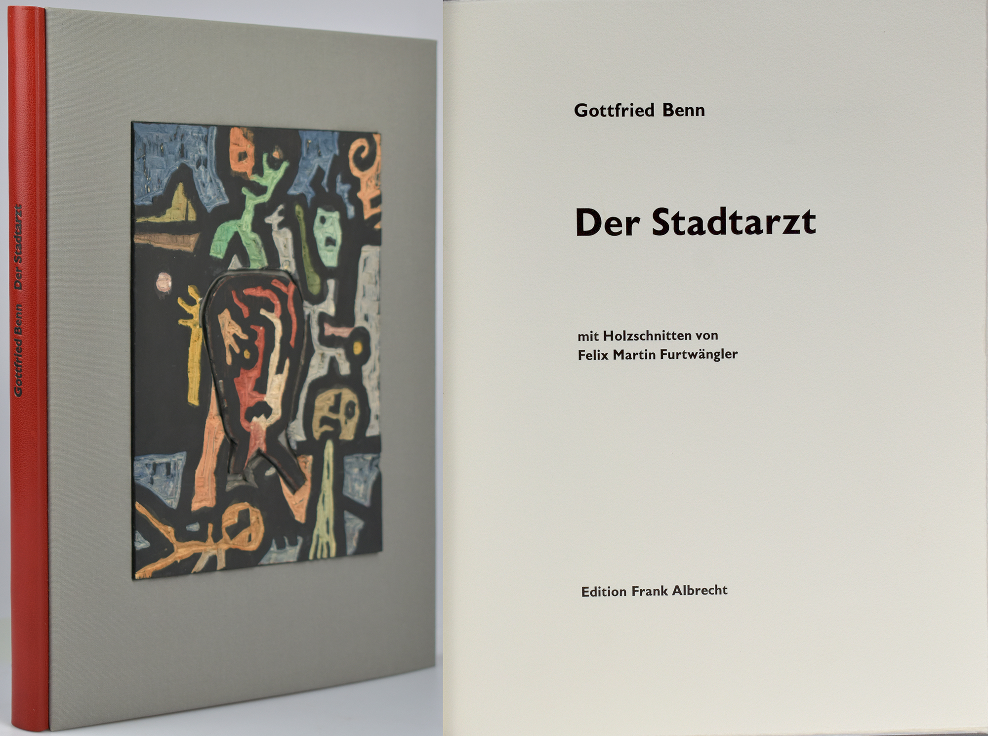 Benn, Gottfried – Furtwängler, Felix Martin: Der Stadtarzt. [Signierte Vorzugsausgabe mit Original-Holzschnitten]. Schriesheim, Edition Albrecht, 1996. 4°. 33 x 25,5 cm. [27] Blatt. Original-Halblederband mit handkoloriertem Holzdruckstock als Deckelrelief und rauem Schnitt. Original-Leinenkassette. (= Dritter Druck der Edition Frank Albrecht).