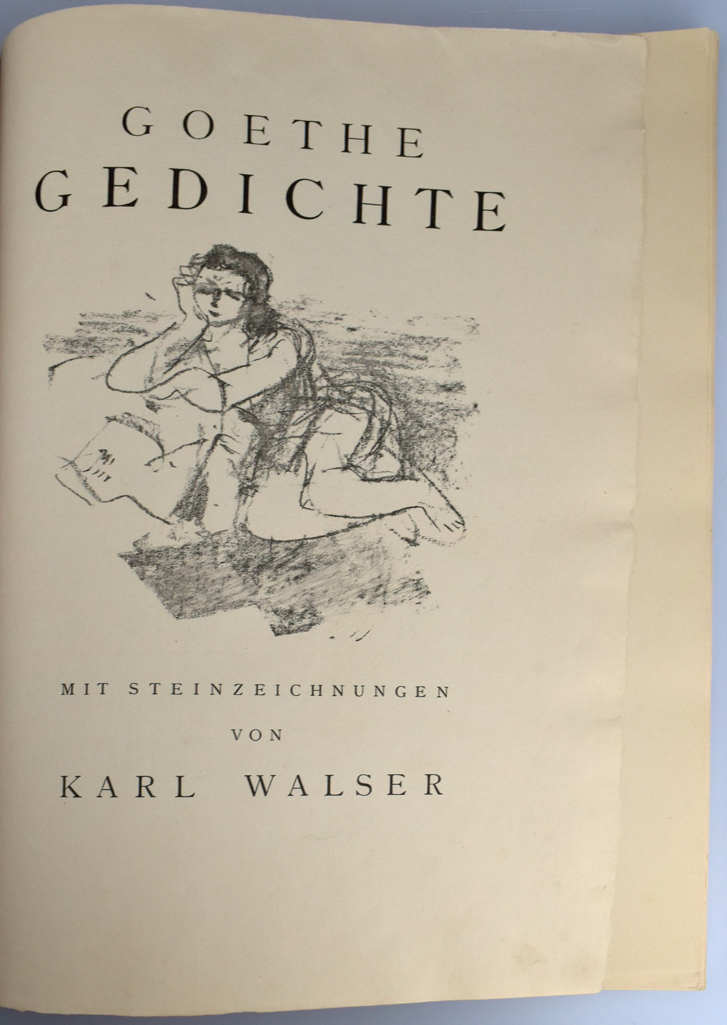 Goethe, Johann Wolfgang von: Gedichte. Mit Steinzeichnungen von Karl Walser. [Signierte Ausgabe mit Original-Lithografien]. Berlin, Verlag Paul Cassirer, 1926. 2°. 40 x 29,5 cm. Handeinband in Original-Pergament mit schwarzgeprägtem Rücken- und Deckeltitel. Handgefertige Leinenkassette. (= Goethes Gedichte mit Illustrationen graphischer Künstler der Gegenwart’ IV).