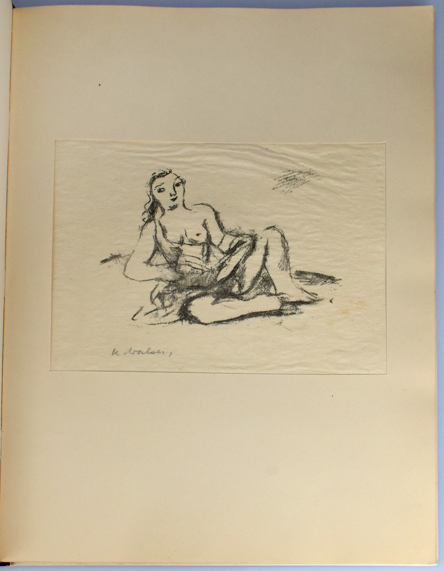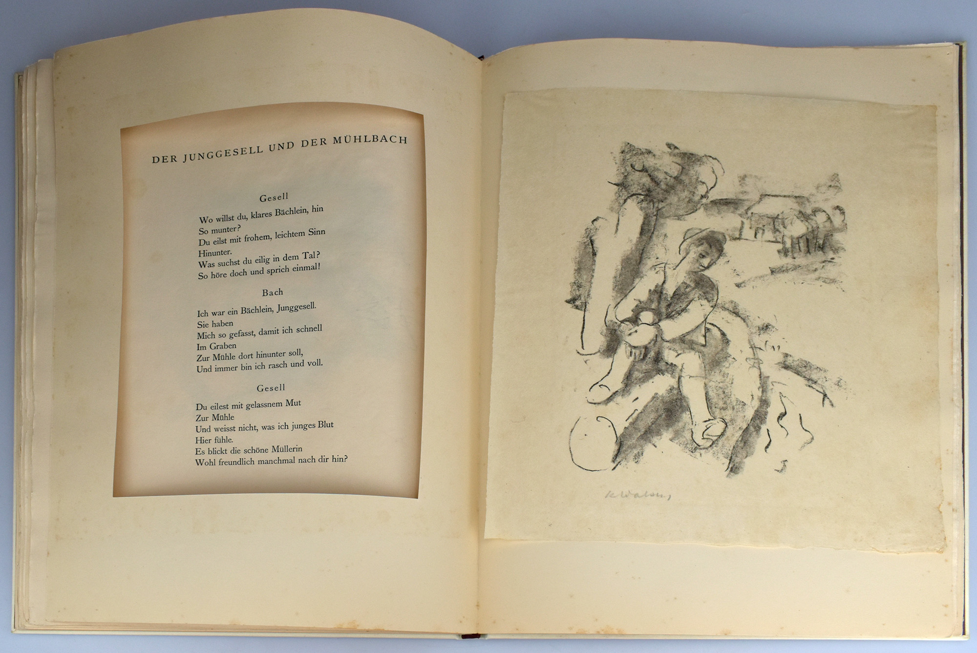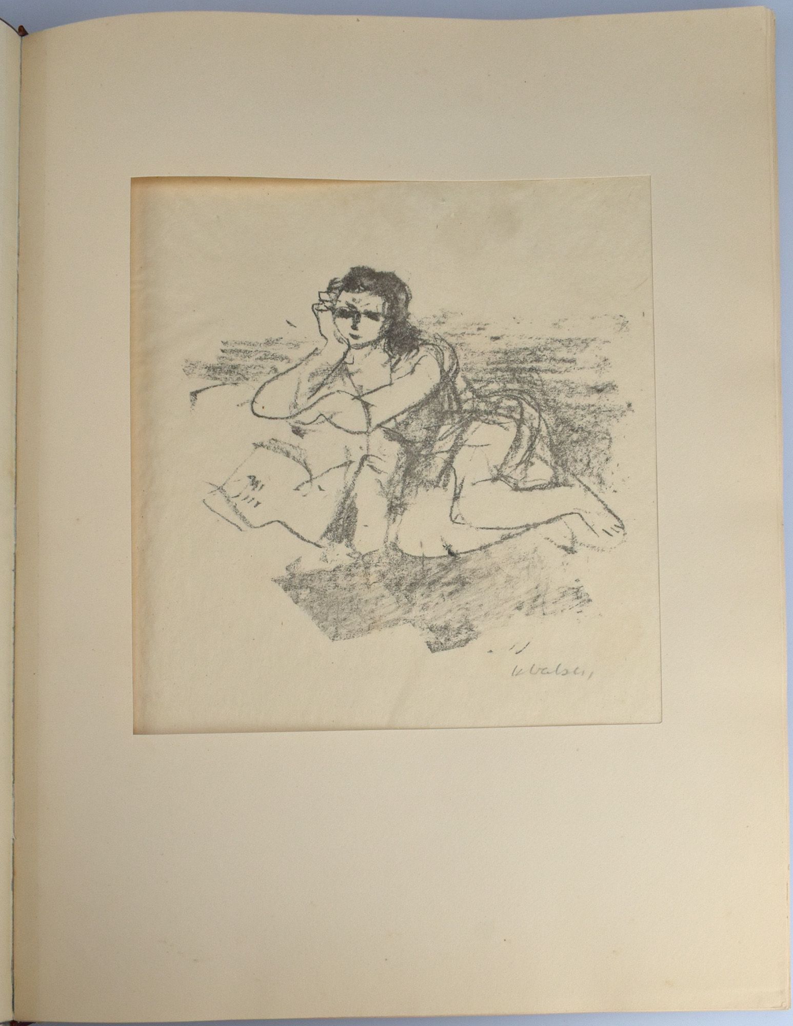 Hand-bound in original vellum with black-stamped spine and cover titles. Custom-made cloth case. Number 43 of 100 numbered copies, with 20 original lithographs (17 of them full-page) printed on Zanders handmade paper from the hand press, and with a second suite containing 18 (of 29) original lithographs by Kurt Walser, signed in pencil, mostly mounted under passepartout and partly including illustrations rejected for the edition. Schauer II, 57. The publication, originally issued in loose sheets, has in this copy been bound together (including the extant lithographs of the additional suite) into a custom binding by the Dutch master bookbinder Gijs Wortel. With gilt-stamped binder’s mark on the inner edge of the lower cover. Cloth case minimally rubbed. Some of the Japan paper faintly foxed and in places slightly wavy. Overall a near fine copy.