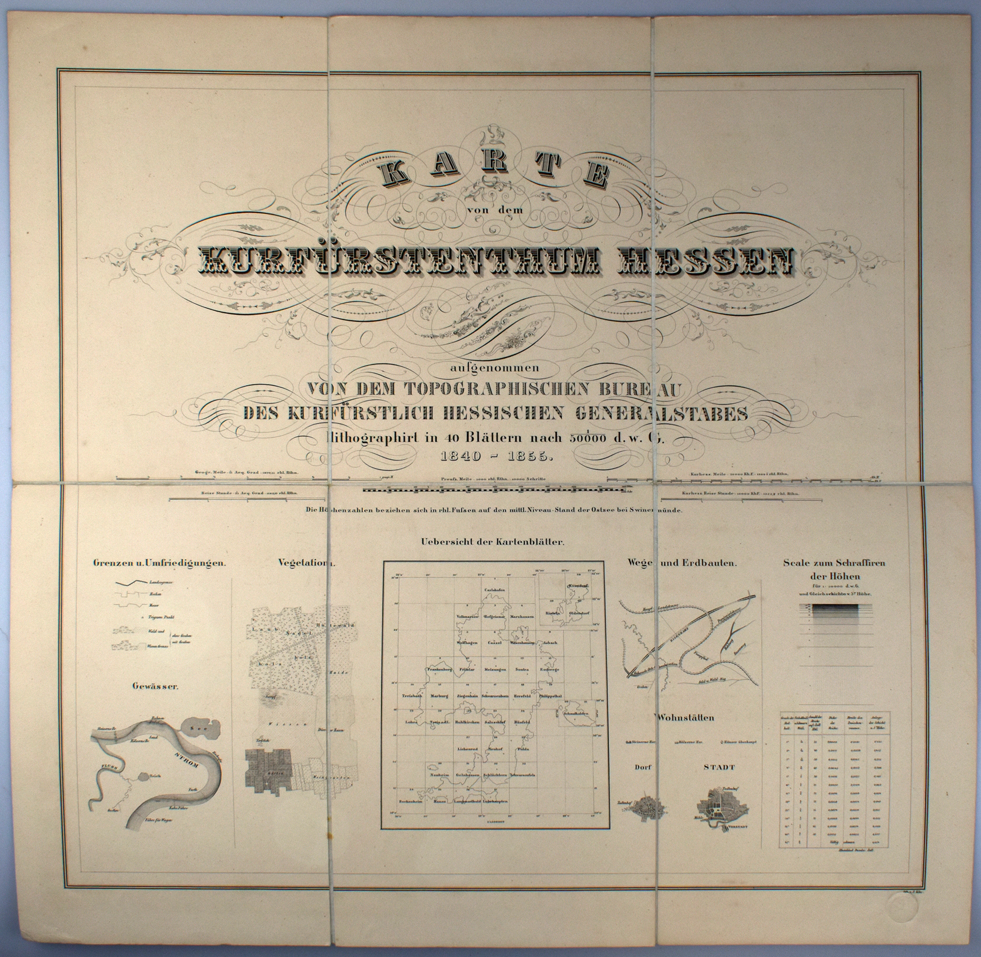 Erste Ausgabe. Engelmann II, 580. Lithografiertes Übersichtsblatt und alle 40 Sektionen auf 39 lithografierten Karten mit Schummerung, jeweils auf Leinen kaschiert. Enthalten sind die folgenden Sektionen: 1) Carlshafen. 2) Volkmarsen. 3) Hofgeismar. 4) Marzhausen. 5) Wolfhagen. 6) Cassel. 7) Witzenhausen. 8) Asbach. 9) Frankenberg. 10) Fritzlar. 11) Melsungen. 12) Sontra. 13) Eschwege. 14) Treisbach. 15) Marburg. 16) Ziegenhain. 17) Schwarzenborn. 18) Hersfeld. 19) Philippsthal. 20/21) Schmalkalden und Steinbach. 22) Lohra. 23) Treis. 24) Ruhlkirchen. 25) Salzschlirf. 26) Hünfeld. 27) Lichenrod. 28) Neuhof. 29) Fulda. 30) Nauheim. 31) Gelnhausen. 32) Schlüchtern. 33) Schwarzenfels. 34) Bockenheim. 35) Hanau. 36) Langenselbold. 37) Lohrhaupten. 38) Nenndorf. 39) Rinteln. 40) Oldendorf.