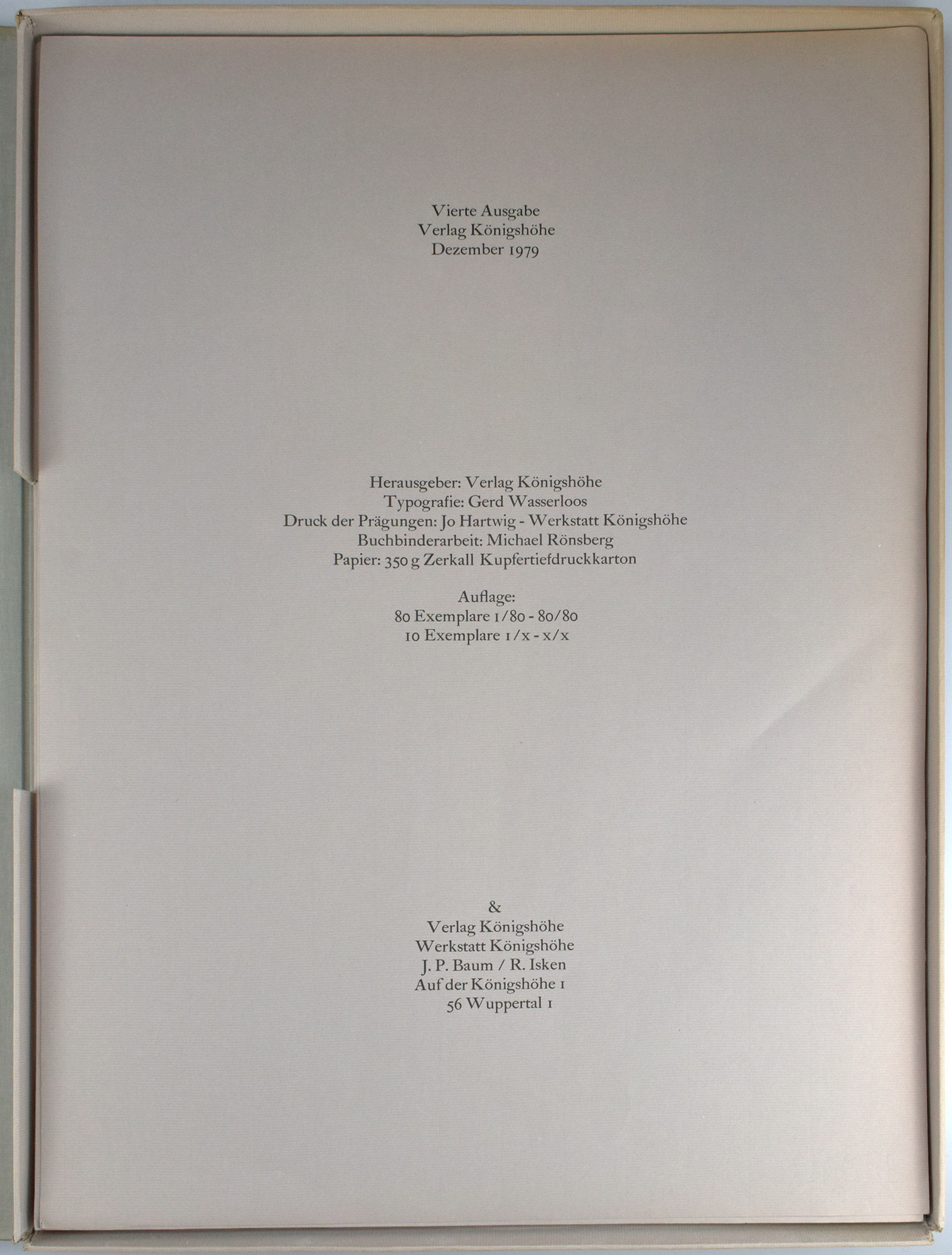 [4] leaves and 10 plates, loose in original half-cloth case with blind-stamped design. Artist’s copy outside the edition (total numbered edition of 90 copies). 10 embossed prints on 350 g Zerkall copperplate printing board, each signed in pencil by Will Sensen, dated 1979, and marked “e.a.” (épreuve d’artiste). Sheet size: 53.5 × 38 cm. Size of the embossed prints varying between approx. 11 × 16.5 cm and 24.5 × 19 cm. Typography by Gerd Wasserloos, embossing printed by Jo Hartwig – Werkstatt Königshöhe, binding work by Michael Rönsberg. Fourth publication of the Verlag Königshöhe. Case slightly rubbed and lightly darkened. Two short edges completely split. Title leaves with slight darkening at margins. Overall a good to very good copy, the embossed prints themselves in excellent condition.