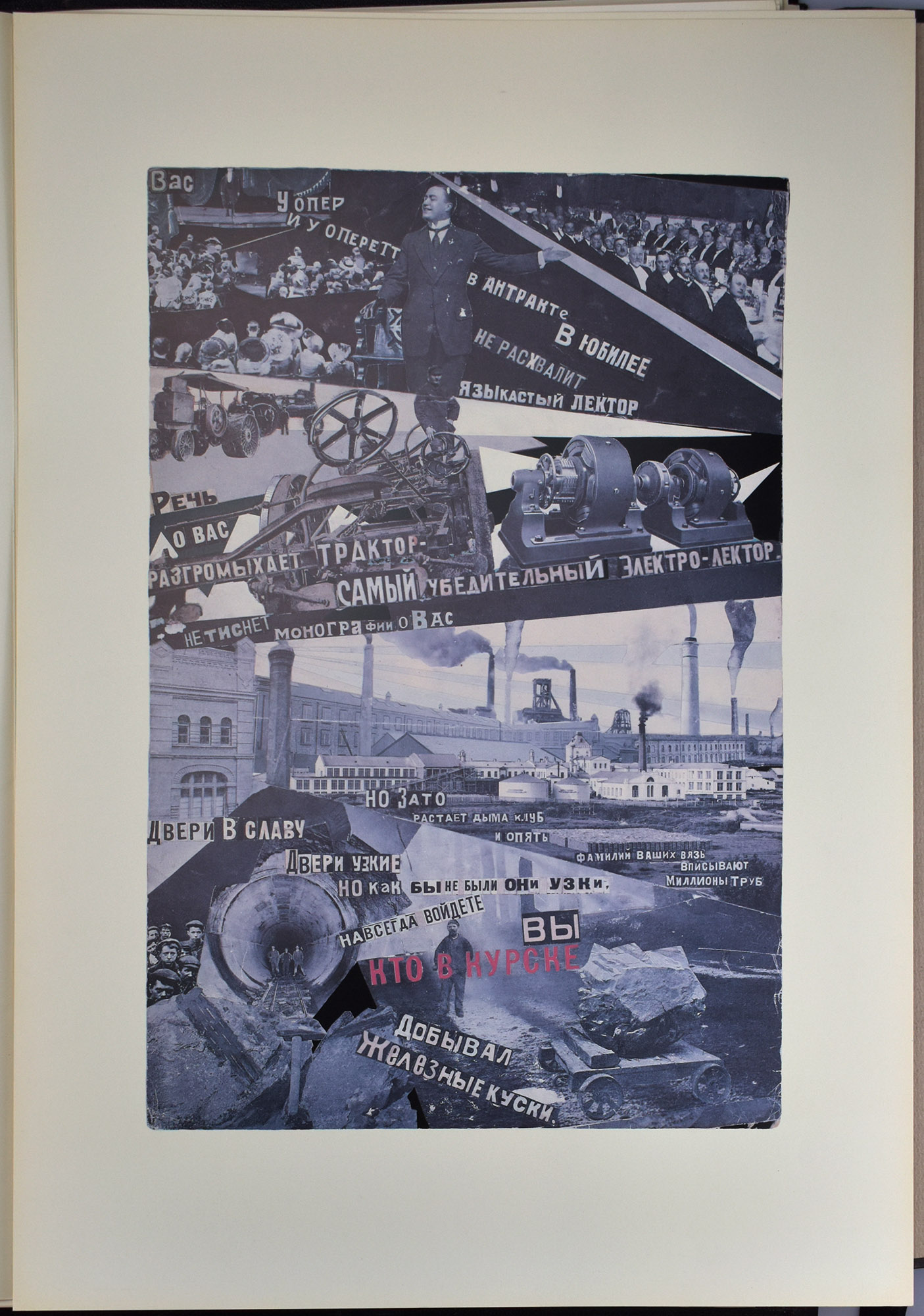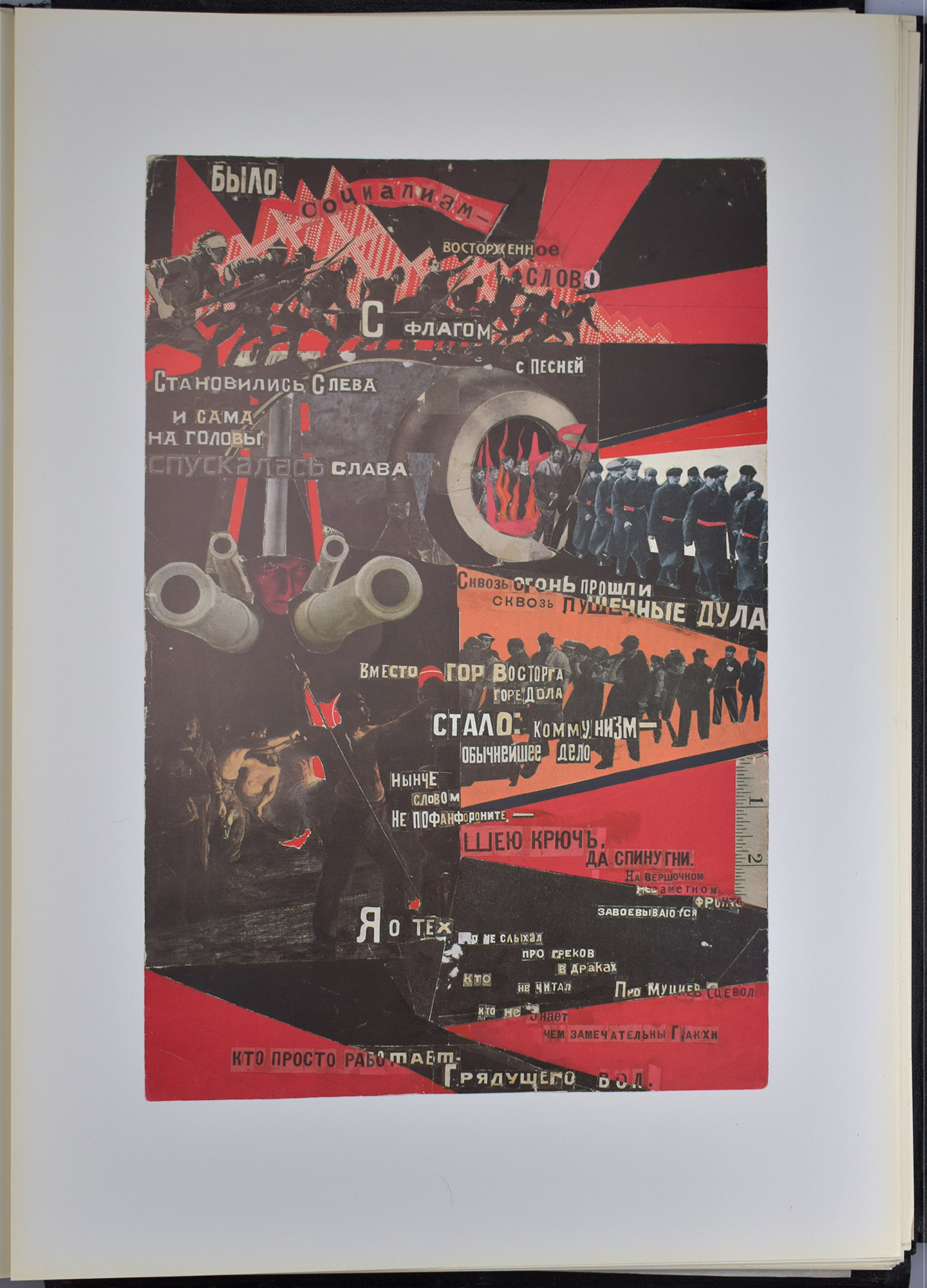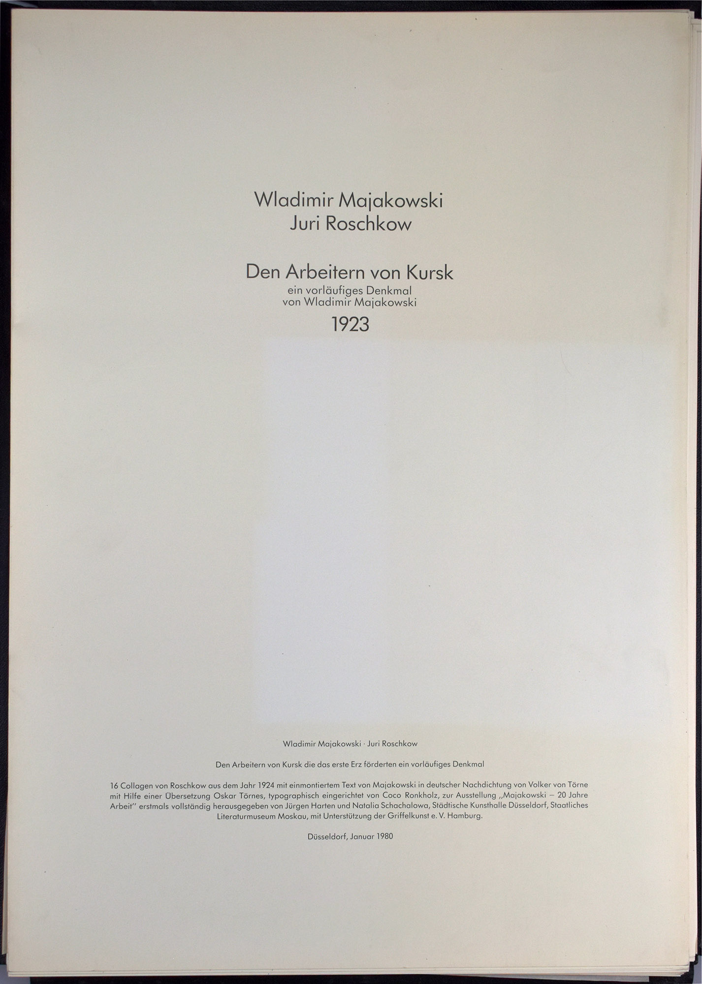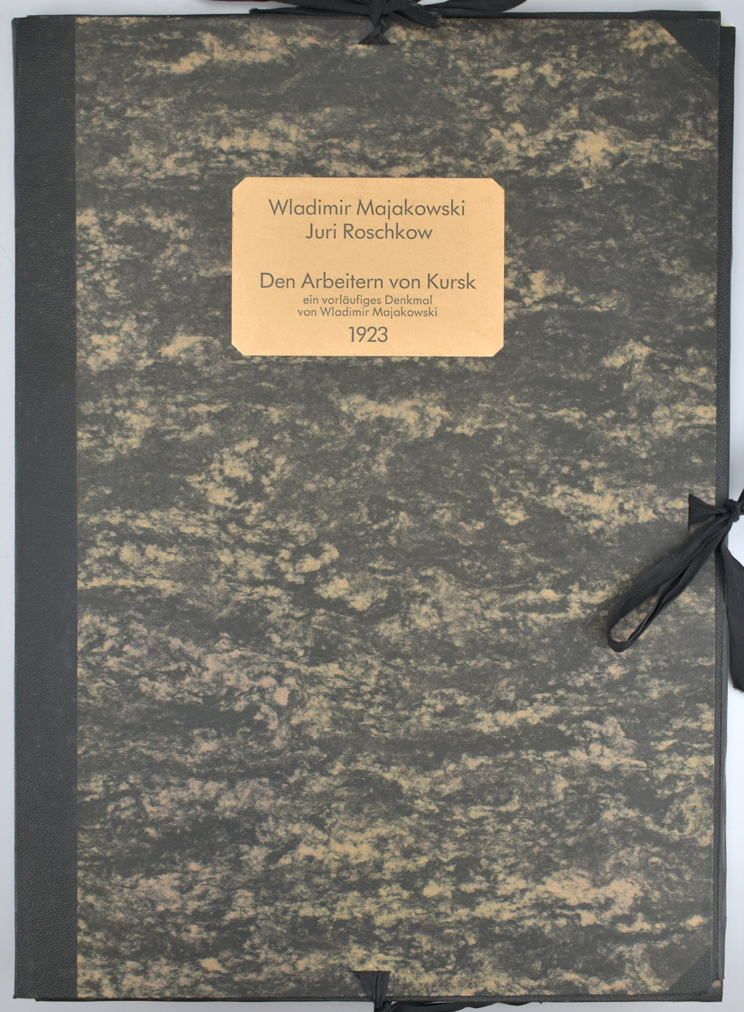 Majakowski, Wladimir; Roschkow, Juri: Den Arbeitern von Kursk. Ein vorläufiges Denkmal von Wladimir Majakowski 1923. 16 Collagen von Roschkow aus dem Jahr 1924 mit einmontierten Text von Majakowski in deutscher Nachdichtung von Volker von Törne. Düsseldorf, 1980. 2°. 50 x 35 cm. [18] Doppelblatt mit 16 eingelegten Farbtafeln lose in Original-Mappe mit Bezug aus kaschiertem Halbleinen und Marmorpapierbezug und mit drei Schleifenverschlüssen.