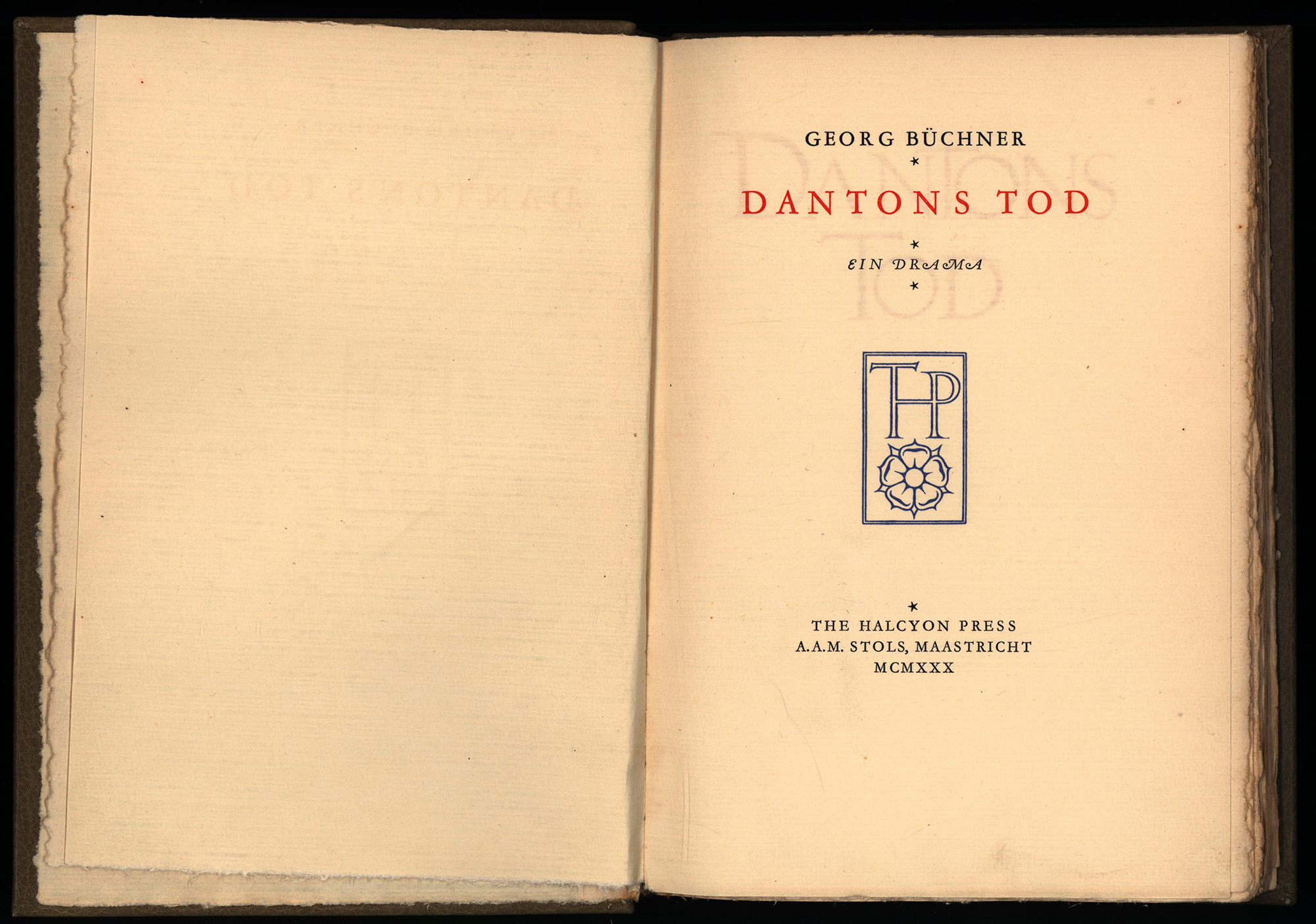 Büchner, Georg: Dantons Tod. Ein Drama. [Handeinband]. Maastricht, Halcyon Press A.A.M. Stols, 1930. Groß-8°. 26 x 18,5 cm. 115 Seiten. Handeinband in grünem Ganzleder.