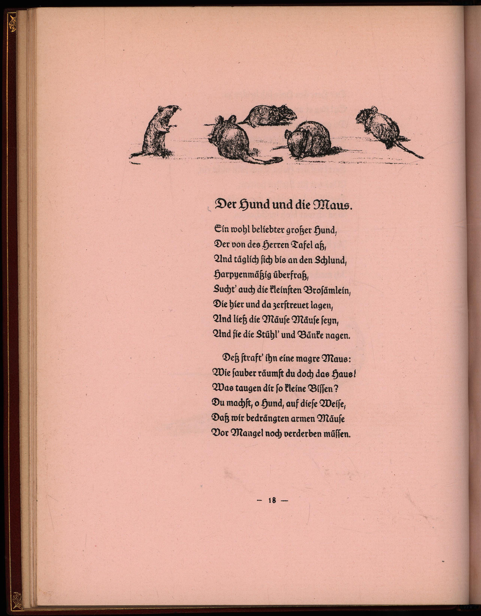 Erste Volksausgabe, dieses Exemplar mit Handeinband von Peter A. Demeter, Hellerau (goldgeprägtes Buchbindersignet auf Innenkante des Hinterdeckels). Feilchenfeldt/Brandis 158.1. Mit 84 zum Teil ganzseitigen Lithografien von August Gaul. Alte Tierfabeln aus Karl Wilhelm Ramlers Fabellese (Leipzig 1783). Der Text und die Lithografien wurden in dieser Ausgabe auf rosa eingefärbtes Papier auf der lithografischen Schnellpresse von M.W. Lassally gedruckt. Einband an Kanten und Bünden stellenweise etwas beschabt. Untere Buchecke mit Stoßstelle mit abgeplatztem Lederbezug (ca. 2 cm). Vorsatzpapier und Vakatblätter etwas gebräunt und gering stockfleckig. Seitenstege durchweg leicht gebräunt, einige Seiten leicht stockfleckig. Insgesamt gutes bis sehr gutes Exemplar.
