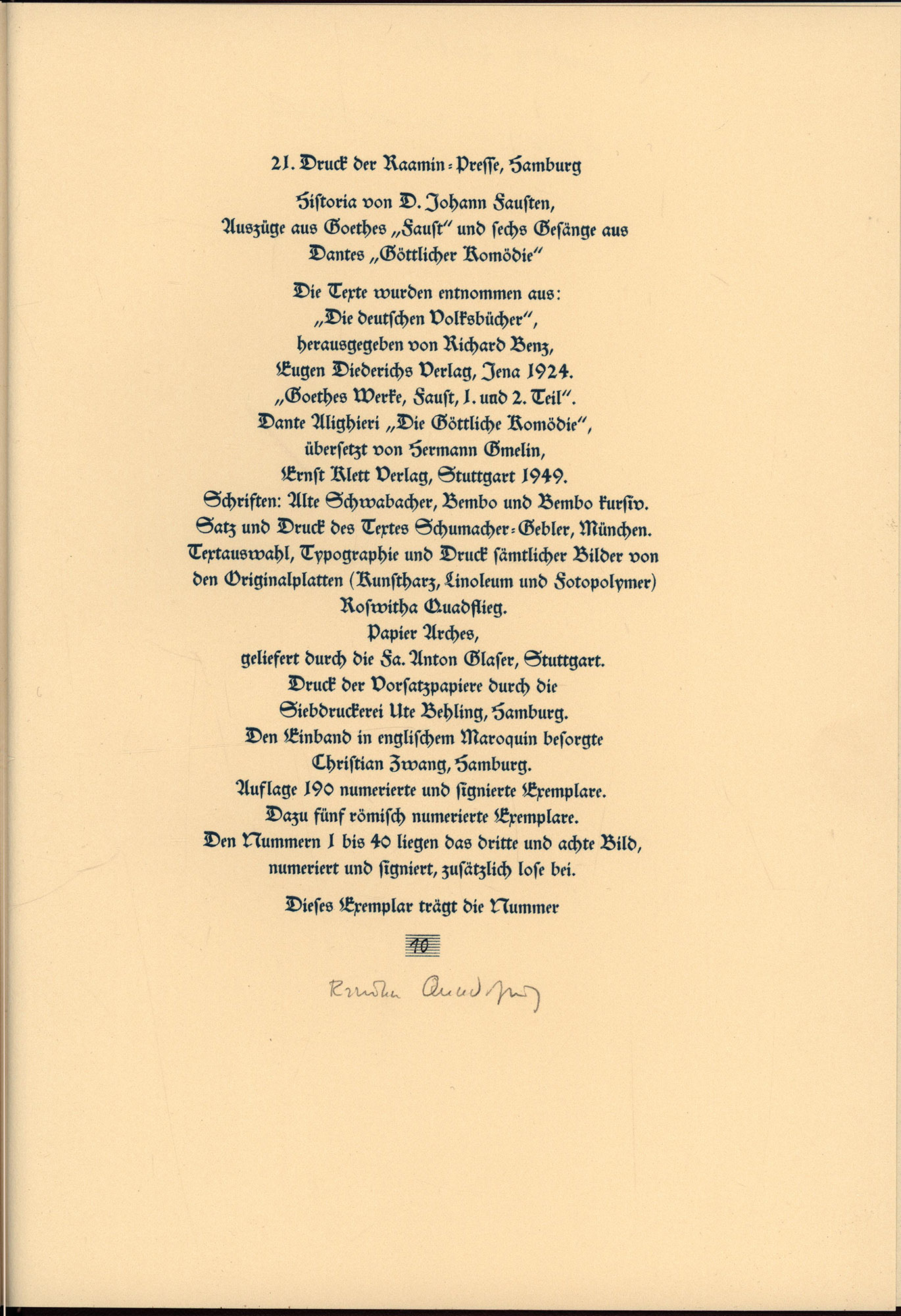 Quadflieg, 21 Kapitel aus der Historia von D. Johann Fausten. Signierte Ausgabe