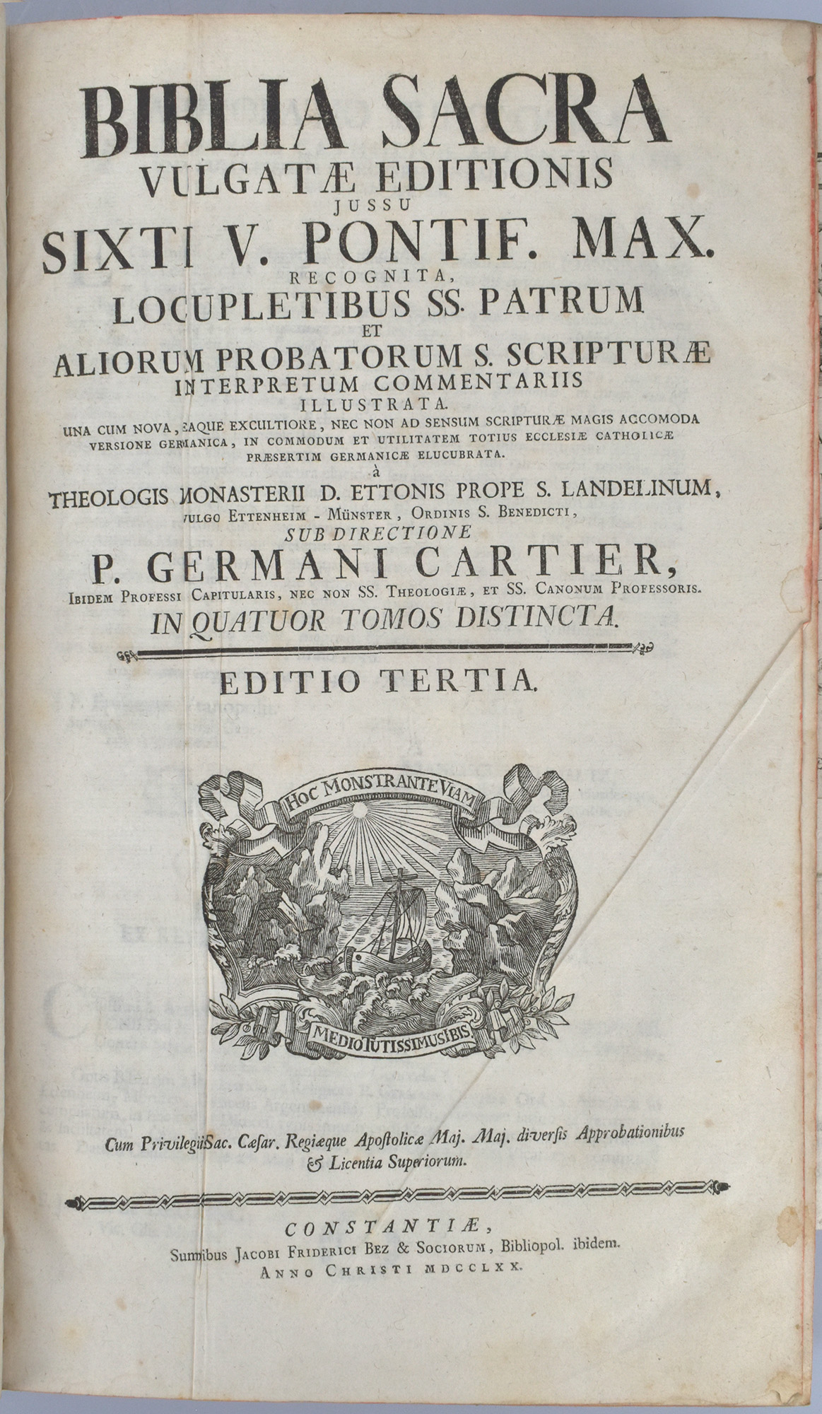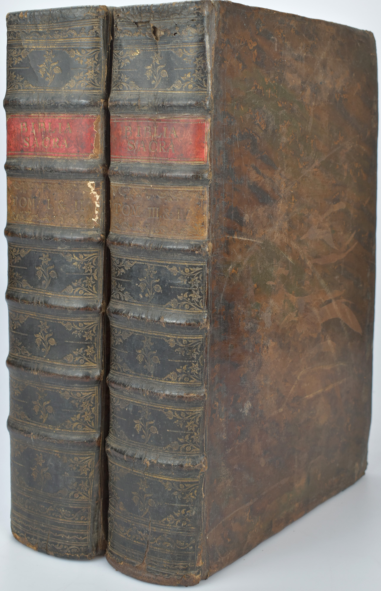 Cartier, Germanus (Hrsg.): Biblia Sacra Vulgatae Editionis. Jussu Sixti V. Pontif. Max. Recognita, Locupletibus SS. Patrum Et Aliorum Probatorum S. Scripturae Interpretum Commentariis Illustrata. Una Cum Nova, […] Versione Germanica, […] Elucubrata. 4 Teile (in 2 Bänden, komplett). Constantiae [Konstanz], Sumptibus Jacobi Friderici Bez [Jakob Friedrich Bez] & Sociorum, Bibliopol. ibidem, 1770. Groß-4°. 38 x 24 cm. [15] Blatt, 758 Seiten, [1] Blatt, 562 Seiten; [1] Blatt, 588 Seiten, [1] Blatt, 12, 571, 48 Seiten, [26] Blatt. Lederbände der Zeit auf 6 Bünden mit floraler Rückenvergoldung, goldgeprägtem Rückentitel auf roten Lederschildchen und mit Rundum-Rotschnitt.