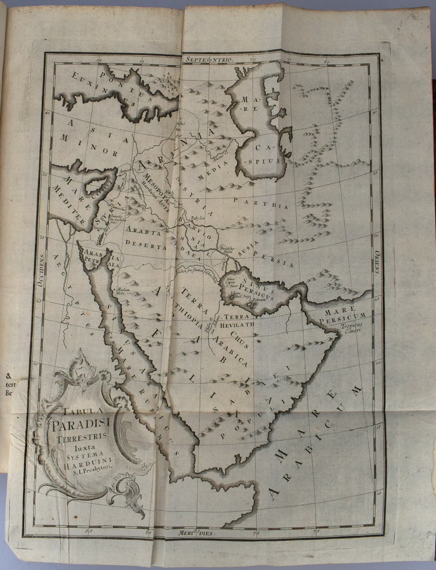 Editio Tertia. Zweisprachige Ausgabe in Deutsch und Latein (Parallelausgabe). Graesse I, 397. Mit insgesamt 65 Kupfertafeln und einer gefalteten Kupfertafel von Jakob Andreas Friedrich, Philipp Gottfried Harder, Georg Daniel Heumann, Philipp Andreas Kilian, Georg Lichtensteger, Johann Georg Pintz, Balthasar Sigmund Sedletzky, Catharina Sperling, Hieronymus Sperling uund Martin Tyroff aus Scheuchzers „Physica Sacra“. Einbände etwas berieben und mit einzelnen kleinen Fehlstellen im Lederbezug. Seiten und Tafeln überwiegend in den Stegen leicht stockfleckig bzw. etwas knickspurig. Insgesamt gutes bis sehr gutes Exemplar.