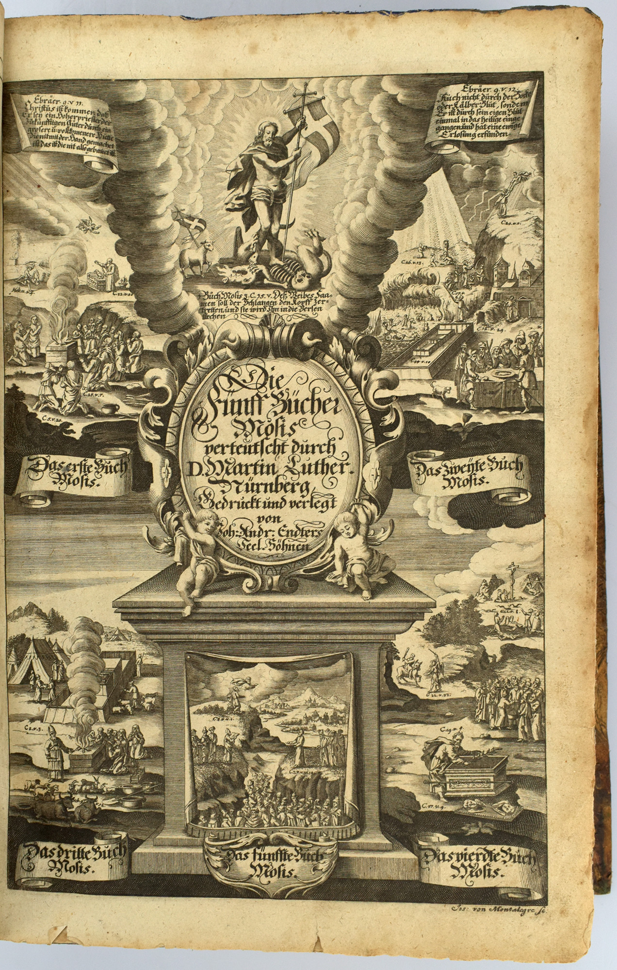 Letzte Ausgabe der Endter I mit der Vorrede des Lutheraners und Nürnberger Pfarrers Johann Michael Dilherr (1609-1669). vgl. Schmidt 372. Mit allegorischem Kupfertitel, Haupttitelblatt in Rot und Schwarz mit Titelvignette in Holzschnitt, einer Porträttafel nach Lucas Cranach durch Engelhard Nunzer, 6 gestochenen Zwischentiteln durch Joseph de Montalegre und über 200 Textholzschnitten der Monogrammisten VW, GL und PC [Paul Creutzberger]. „Die Bilder zeigen in ihren Figuren, Gegenständen und Landschaften den Charakter ihrer Zeit. […] doch haben alle drei Illustratoren, besonders der Monogrammist VW, ganz selbstständig neue Themen der biblischen Geschichte zur Illustration ausgewählt, oder alte in neuer Auffassung dargestellt, die einen genaue Kenntnis des biblischen Texts verrät.“ (Schmidt, ibidem). Einband und Schnitt etwas berieben, leicht bestoßen und etwas fleckig. Einbandschließen entfernt. Vakatblätter mit Tinteneintragungen der Zeit, vorderer Spiegel mit Exlibris späterer Zeit. Seiten gering gebräunt und leicht stockfleckig. Einige Seiten mit sauber reparierten oder fachmännisch hinterlegte Randeinrissen bzw. Fehlstellen. Insgesamt gutes bis sehr gutes Exemplar.