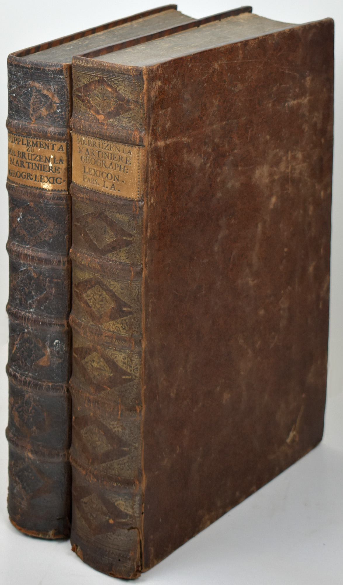 Bruzen de La Martinière, Antoine Augustin: Historisch-politisch-geographischer Atlas der gantzen Welt oder grosses und vollständiges geographisch- und critisches Lexicon. Darinnen die Beschreibung des Erd-Kreises, aller Monarchien, Kayserthümer, Königreiche, Chur- und Fürstenthümer, Republiquen, freyen Staaten, Stände und Herrschafften, Länder, Städte […] nebst denen dazu gehörigen Denck- und Merckwürdigkeiten enthalten. Aus des berühmten Königl. Spannischen Geographi Mr. Bruzen la Martinière Dictionnaire géographique et critique ins Deutsche übers. Mit vielen tausend Artickeln vermehret und durchgängig aus den neuesten Geschichten verbessert 13 Bände (12 Hauptbände und Supplementband, komplett). Leipzig, verlegt durch Johann Samuel Heinsius, 1744-1750. 2°. 40,5 x 27,5 cm. [12], XX Blatt, 1903 Spalten; [8] Blatt, 1983 Spalten; [6] Blatt, 2144 Spalten; [6] Blatt, 2008 Spalten; [6] Blatt, 1960 Spalten; [4] Blatt, 2080 Spalten; [6] Blatt, 2166 Spalten; [4] Blatt, 1984 Spalten; [8] Blatt, 1960 Spalten; [4] Blatt, 1744 Spalten; [4] Blatt, 1934 Spalten; [8] Blatt, 1816 Spalten; [4] Blatt, 1824 Spalten. Lederbände der Zeit auf 6 Bünden mit ornamentaler Rückenvergoldung, schwarzgeprägten Rückentiteln und blauen Sprengschnitten.