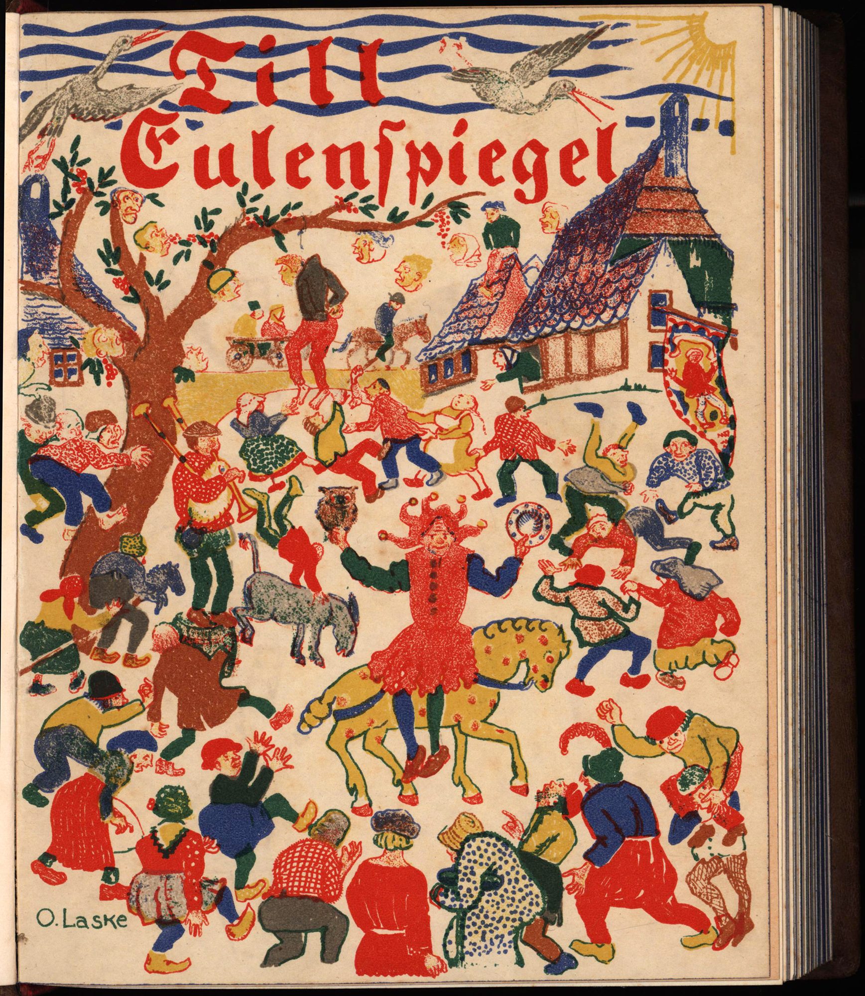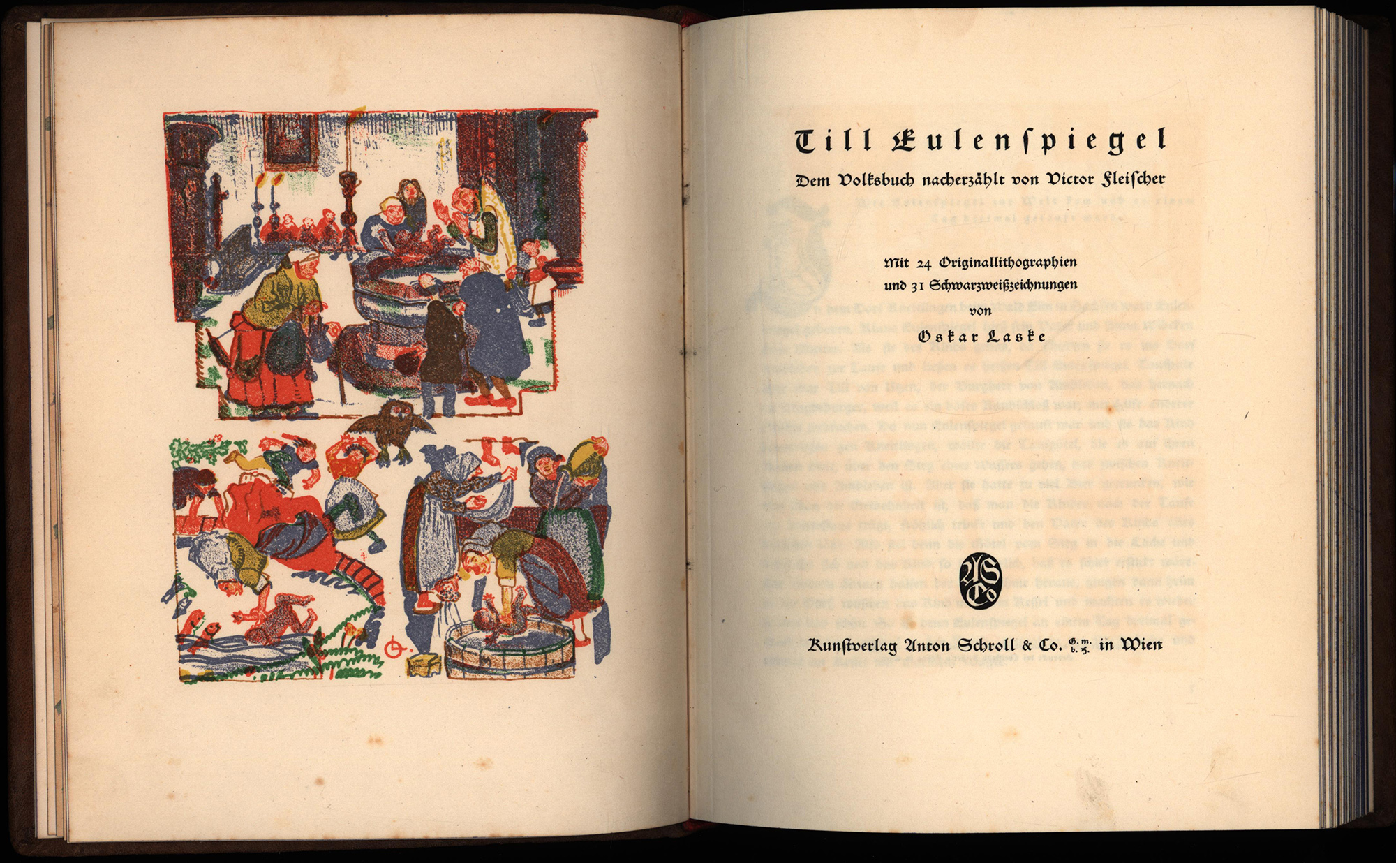 Fleischer, Victor – Laske, Oskar: Till Eulenspiegel. Dem Volksbuch nacherzählt. Mit 24 Originallithographien und 31 Schwarzweißzeichnungen von Oskar Laske. [Signierte Vorzugsausgabe]. Wien, Kunstverlag A. Schroll & Co., 1920. Groß-8°. 23 x 18 cm. 138 Seiten. 24 Tafeln. Lederband auf 4 Zierbünden mit blindgeprägtem Rückentitel, blindgeprägter Deckelillustration und Rundum-Blauschnitt.