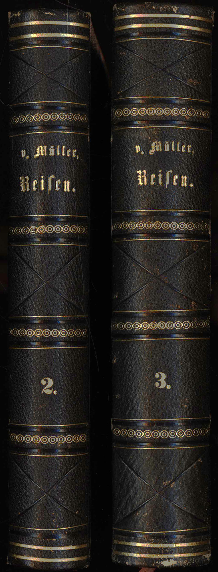 Müller, Johann Wilhelm von: Reisen in den Vereinigten Staaten, Canada und Mexico. Mit Stahlstichen, Lithographien und in den Text eingedruckten Holzschnitten. Bände 2 und 3 (von 3). Leipzig, Brockhaus Verlag, 1864-1865. Groß-8°. 23 x 16 cm. Halblederbände der Zeit mit goldgeprägten Rückentiteln, goldgeprägten Rückenfileten und Rundum-Marmorschnitt.