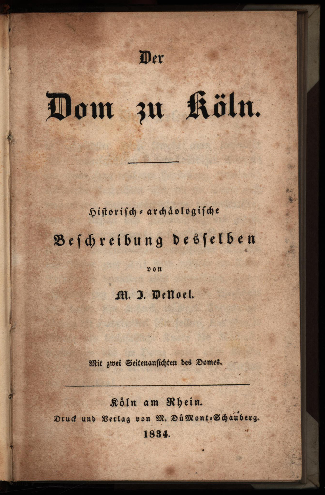 Noël, Matthias Josef de: Der Dom zu Köln. Historisch-archäologische Beschreibung desselben. Mit zwei Seitenansichten des Domes. Beigebunden: Montanus: Das Kloster Altenberg im Dhünthale und das Mönchswesen. 2 Werke in 1 Band. Köln, Verlag DuMont-Schauberg, 1834. Klein-8°. 17 x 11,5 cm. 127 Seiten. Halblederband im Stile der Zeit auf 4 Bünden mit goldgeprägtem Rückentitel und Pergamentecken.