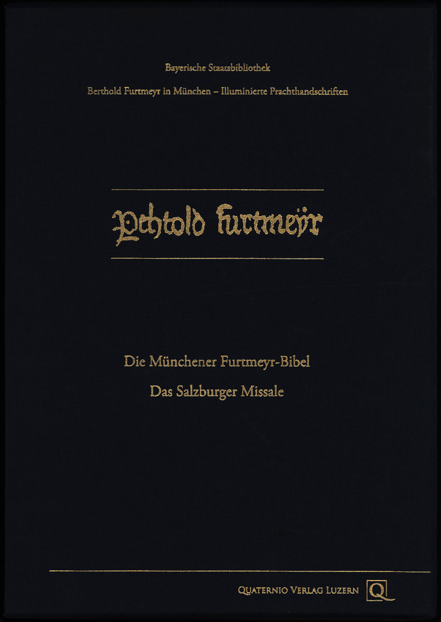 Fabian, Claudia; Bubenik, Claudia: Berthold Furtmeyr in München – Illuminierte Prachthandschriften. Herausgegeben von der Bayerischen Staatsbibliothek. Redaktion: Claudia Bubenik. 1. Band: Die Münchner Furtmeyr-Bibel. Bayerische Staatsbibliothek Cgm 8010a. Abbildungen aller Miniaturen aus der Handschrift mit einer Einführung und Beschreibung von Beatrice Hernad. 2. Band: Das Salzburger Missale. Bayerische Staatsbibliothek Clm 15708-15712. Abbildungen aller Miniaturen aus der Handschrift mit einer Einführung und Beschreibung von Karl-Georg Pfändtner. 2 Bände (komplett). Luzern, Quaternio Verlag, 2011. 4°. 33 x 24 cm. 175 und 207 Seiten. Illustrierte Original-Leinenbände mit goldgeprägtem Rücken- und Deckeltitel im illustrierten Original-Leinenschuber.