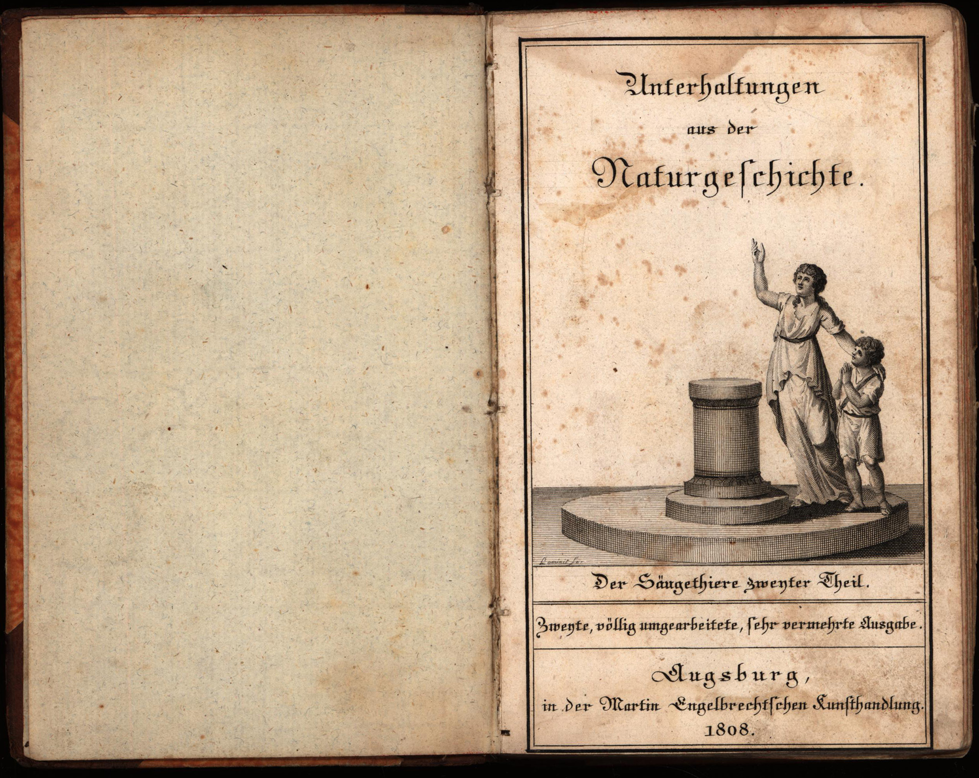 Wilhelm, Gottlieb Tobias: Unterhaltungen aus der Naturgeschichte. Der Säugethiere zweiter Theil. Zweyte, völlig umgearbeitete, sehr vermehrte Ausgabe. Band 2 (von 2). Augsburg, Verlag der Engelbrechtischen Buchhandlung [Engelbrecht], 1808. Klein-8°. 17 x 11 cm. Halblederband der Zeit.
