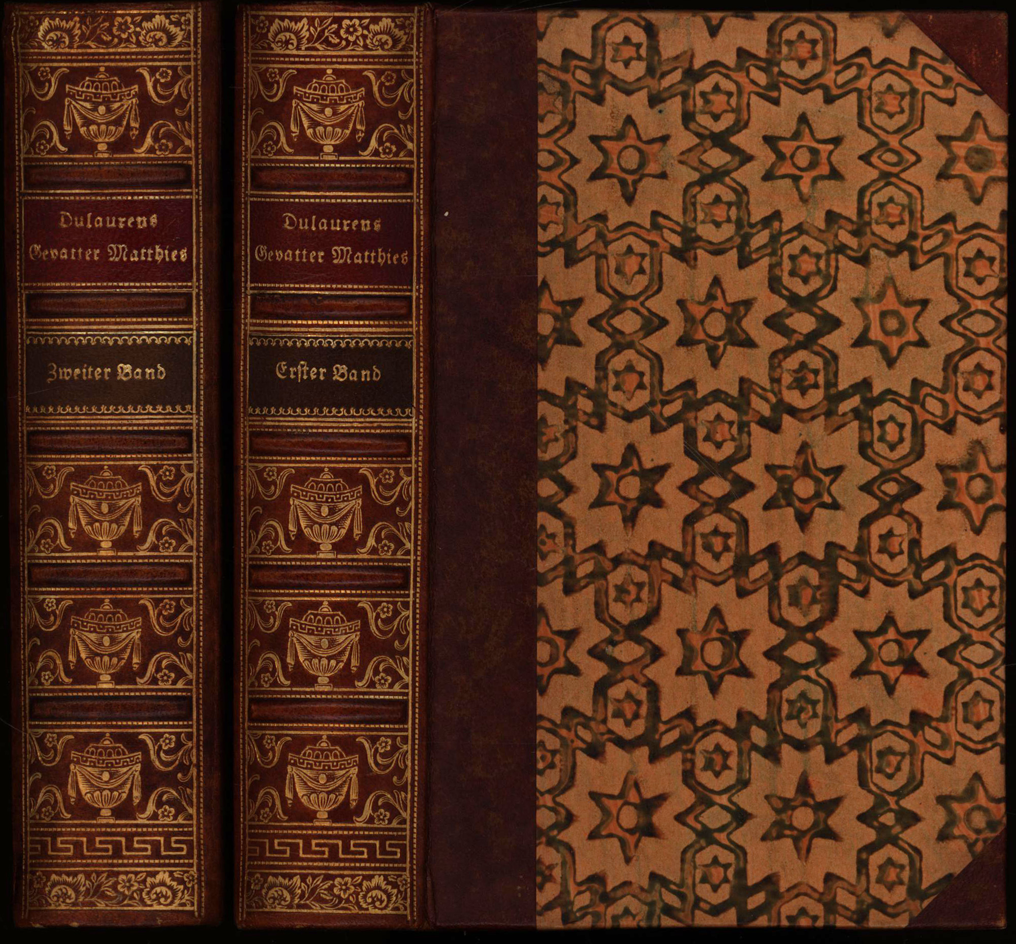 Du Laurens, Henri-Joseph: Gevatter Matthies oder die Ausschweifungen des menschlichen Geistes. 2 Bände (= komplett). München/Berlin, Verlag Georg Müller, 1918. Klein-8°. 15,5 x 11 cm. XXII, 408 Seiten; 4 Blatt, 463 Seiten. Original-Halblederbände mit reicher Rückenvergoldung, goldgeprägten Titeln auf Lederrückenschildchen und Deckelbezügen in Buntpapier. (= Die Bücher der Abtei Thelem, Band 17 und 18).