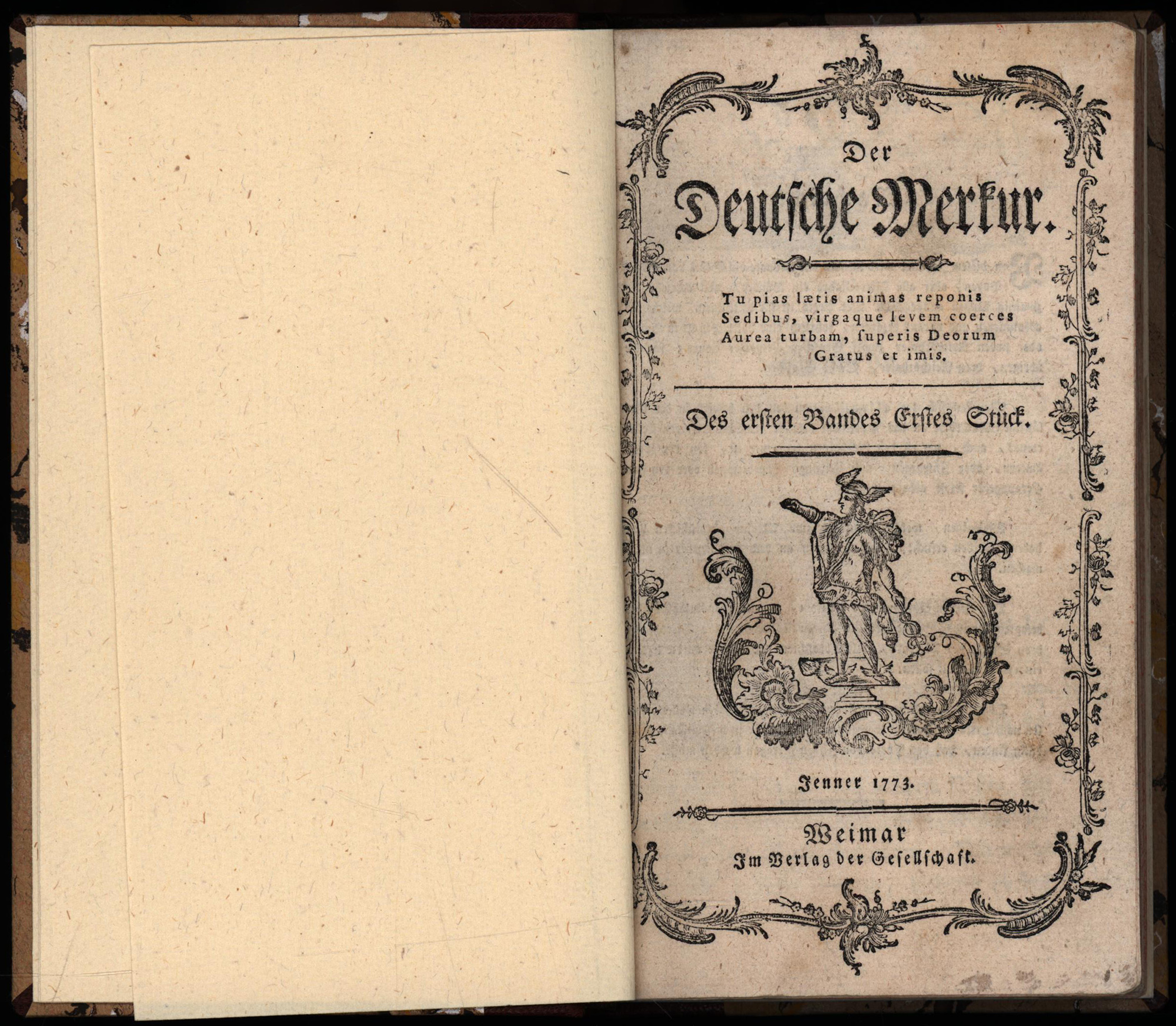 Wieland, Christoph Martin (Hrsg.): Der Deutsche Merkur. Des ersten Bandes erstes, zweytes [und] drittes Stück. 3 Teile (in 1 Band). Weimar, im Verlag der Gesellschaft, 1773. Klein-8°. 17,5 x 11 cm. 288 Seiten. Späterer Halblederband im Stile der Zeit auf 4 Bünden mit blindgeprägtem Rückenschild, marmoriertem Deckelbezug und Sprengschnitt. Im passenden Pappschuber mit Buntpapierbezug.