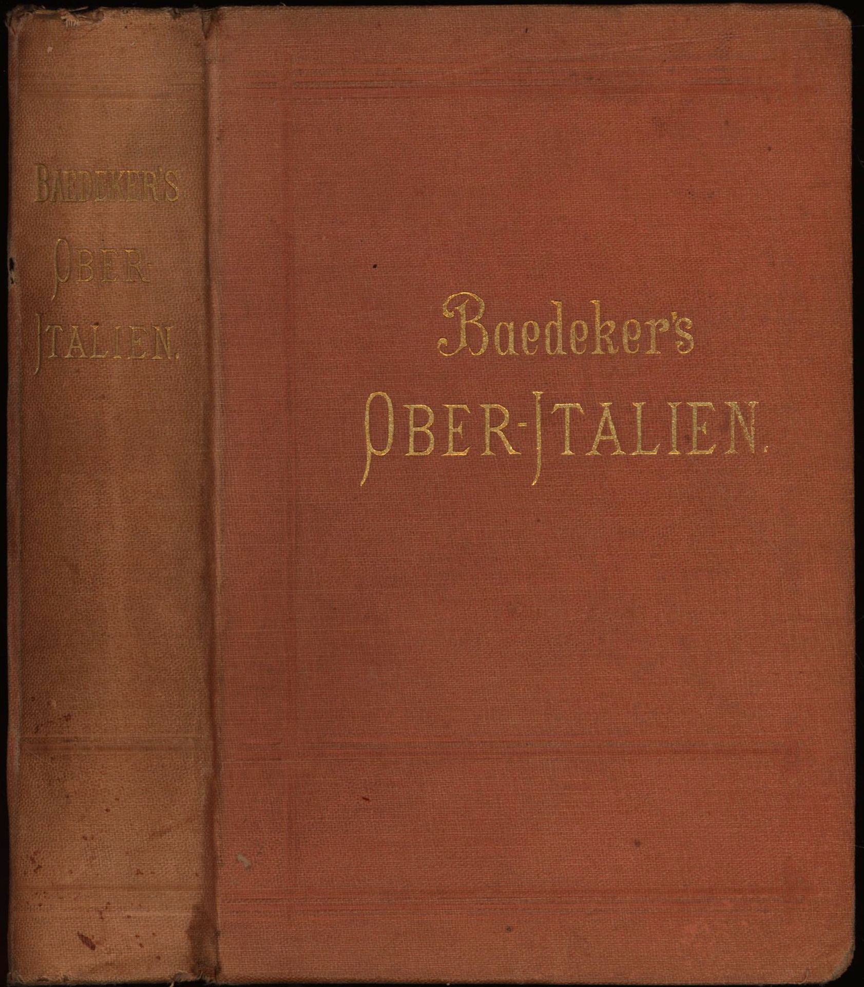 Baedeker, Karl: Italien [Abweichender Deckeltitel: Ober-Italien]. Handbuch für Reisende. Erster Theil Ober-Italien bis Livorno, Florenz und Ravenna nebst Ausflug nach Nizza und nach Ajaccio (Corsica). Mit 17 Karten und 29 Stadtplänen. Leipzig, Baedeker Verlag, 1889. Klein-8°. 16 x 11,5 cm. LXII, 467 Seiten. Roter Original-Leinenband mit goldgeprägtem Rücken- und Deckeltitel. (Baedekers Reisehandbücher).