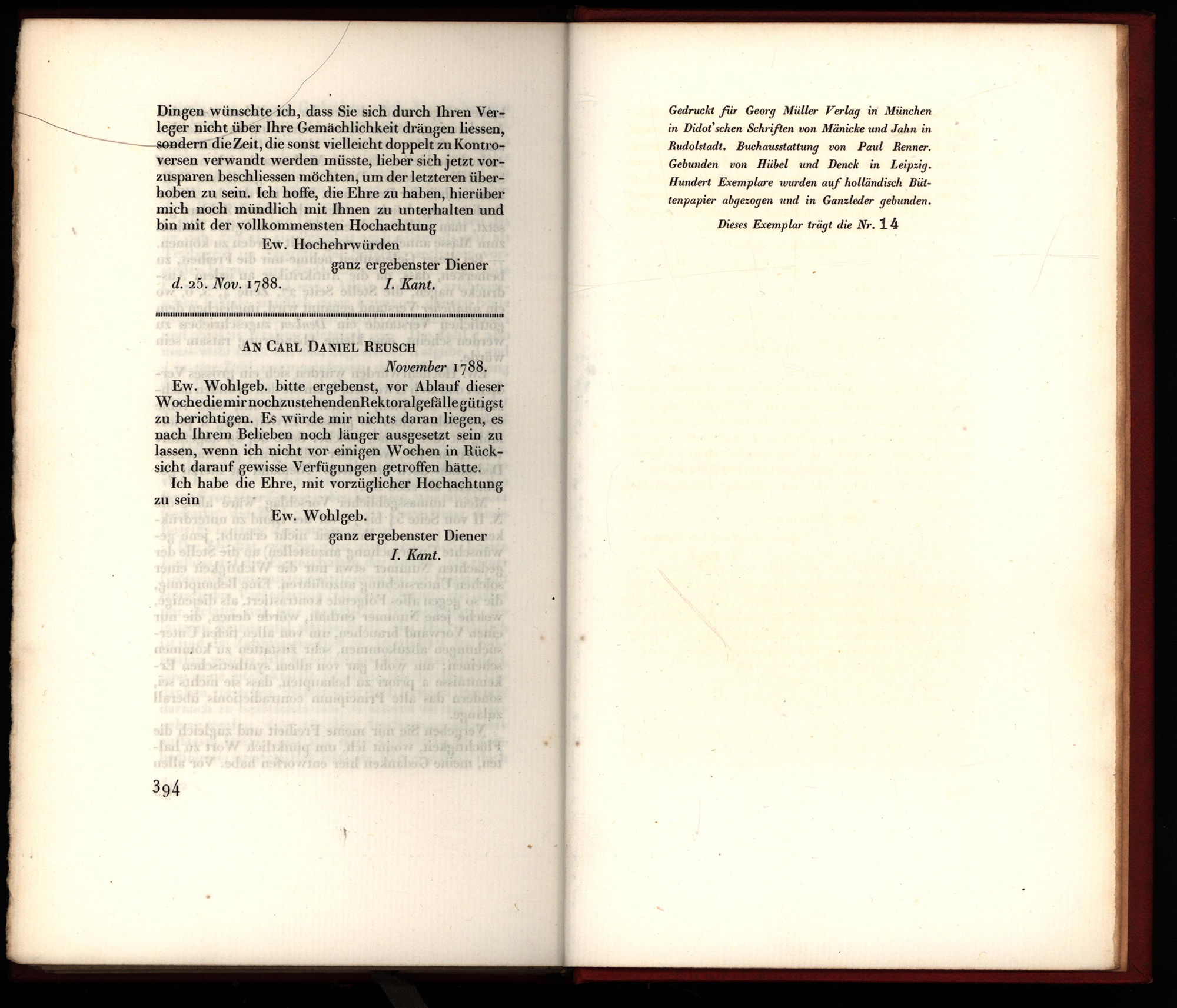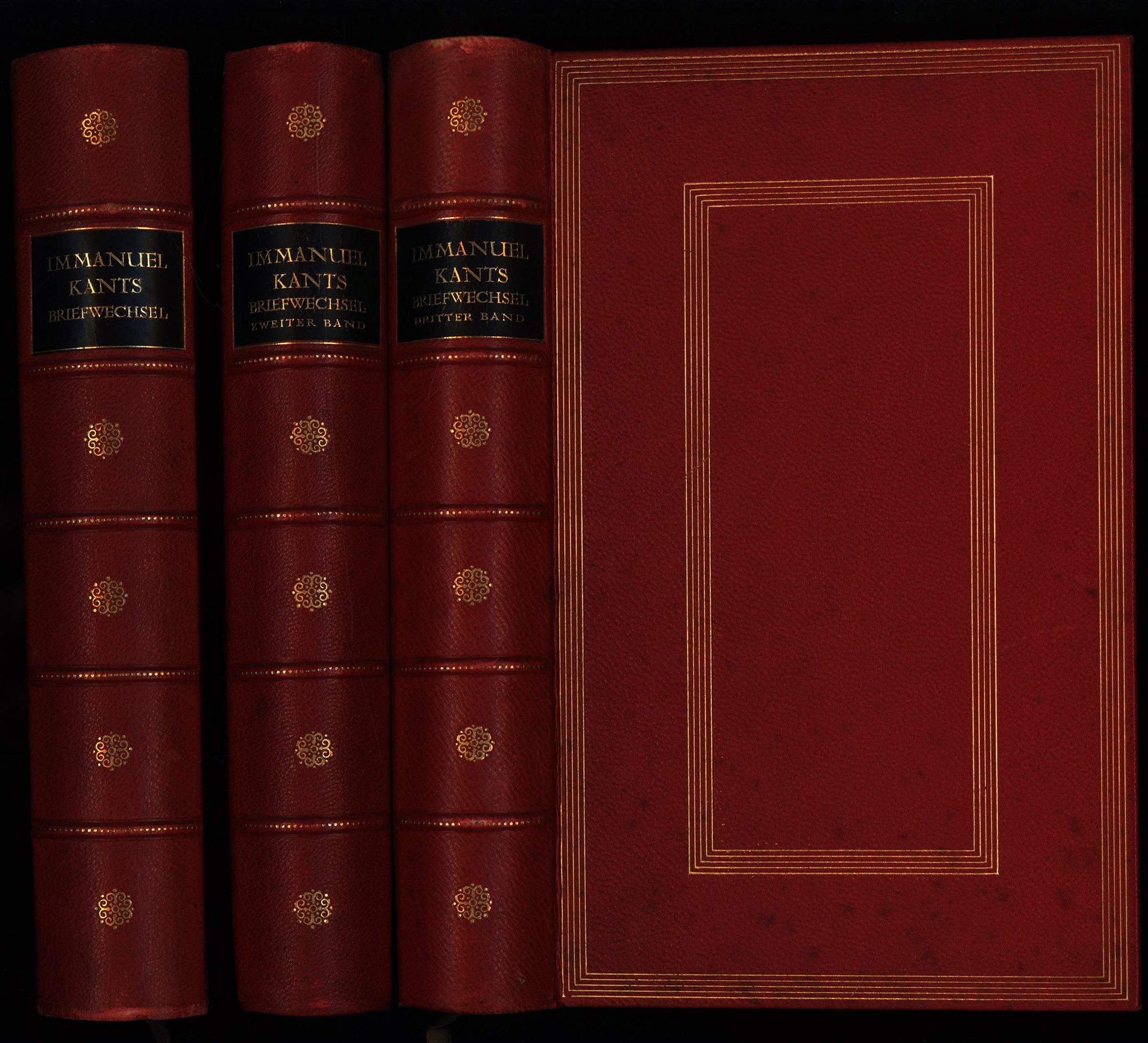 Kant, Immanuel – Fischer, H.E. (Hrsg.): Briefwechsel von Imm. Kant. München, Verlag Georg Müller, 1912-1913. Groß-8°. 23 x 15 cm. XV, 394 Seiten, [1] Blatt; [2] Blatt, 403 Seiten; [2] Blatt, 400 Seiten, [1] Blatt. Rote Original-Lederbände auf 5 Bünden mit floraler Rückenprägung, goldgeprägtem Titel auf schwarzem Lederrückenschild, goldenen Rücken- und Deckelfileten, Kopfgoldschnitt und zweiseitig rauem Schnitt. (= Bibliothek der Philosophen, Bände 1, 6, 7).