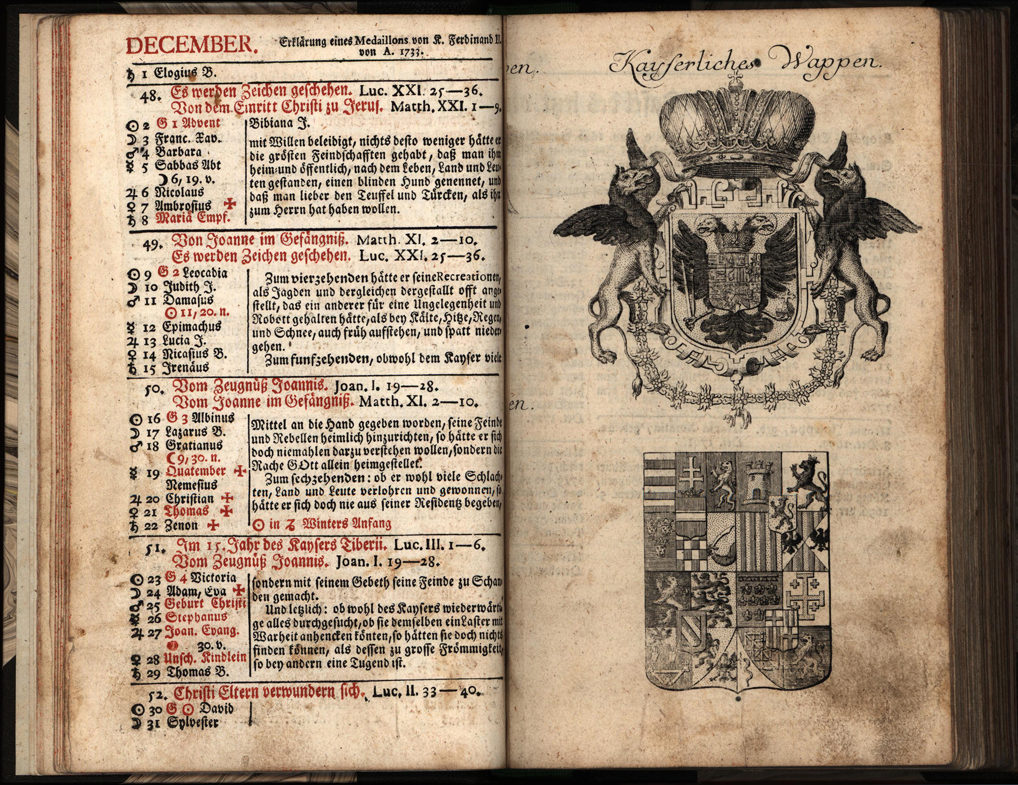 Der durchlauchtigen Welt zum Zwanzigstenmahl neu vermehrter und verbesserter Geschichts-, Geschlechts- und Wappen-Calender. Nebst historischer Erklärung eines Medaillons, vom Kayser Ferdinand II. Auch kurtzer Vorstellung aller jetzt-regierender Kayser, Könige, Churfürsten, geistlicher und weltlicher Fürsten, und Grafen des H. R. Reichs, nach ihren Lebens- und Regierungs-Jahren, wie auch einiger auswärtiger Fürsten, des Pabstes, und der Cardinäle. Nürnberg, gedruckt durch Christoph Weigel, 1742. 8°. 20,5 x 14 cm. [10], 70 Blatt, Seite [69] – 116, [2] Blatt. Moderner Halblederband mit goldgeprägtem Rückentitel, marmoriertem Deckelbezug und rotem Sprengschnitt.