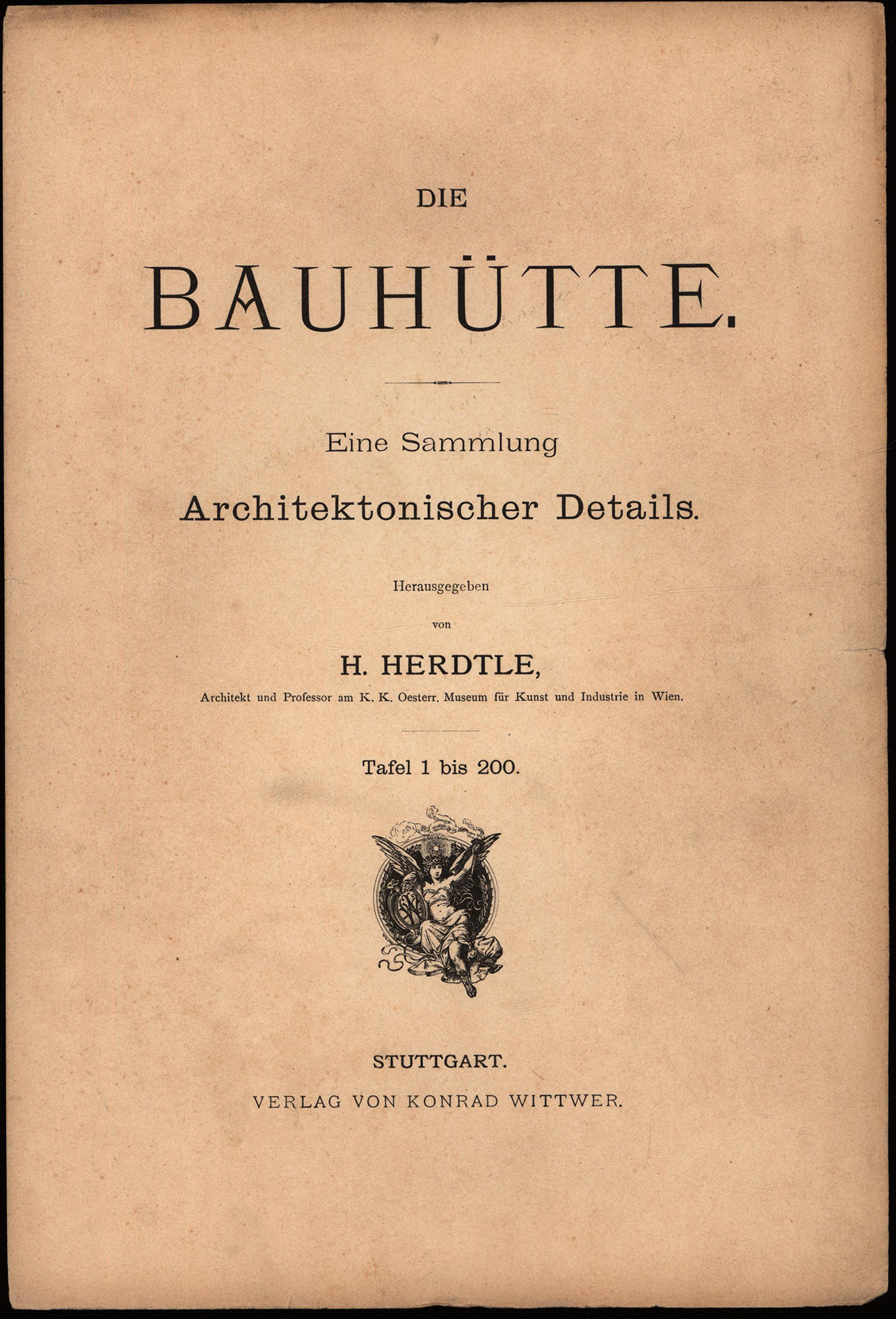 Herdtle, Hermann: Die Bauhütte. Eine Sammlung architektonischer Details. Tafel 1 bis 200 [und] Tafel 201 bis 400. 2 Mappen (von 5). Stuttgart, Verlag Konrad Wittwer, [um 1880]. 4°. 31 x 21,5 cm. [2] Blatt und 394 [von 400] Tafeln lose in zwei Original-Halbleinenmappen mit Schleifenverschlüssen.