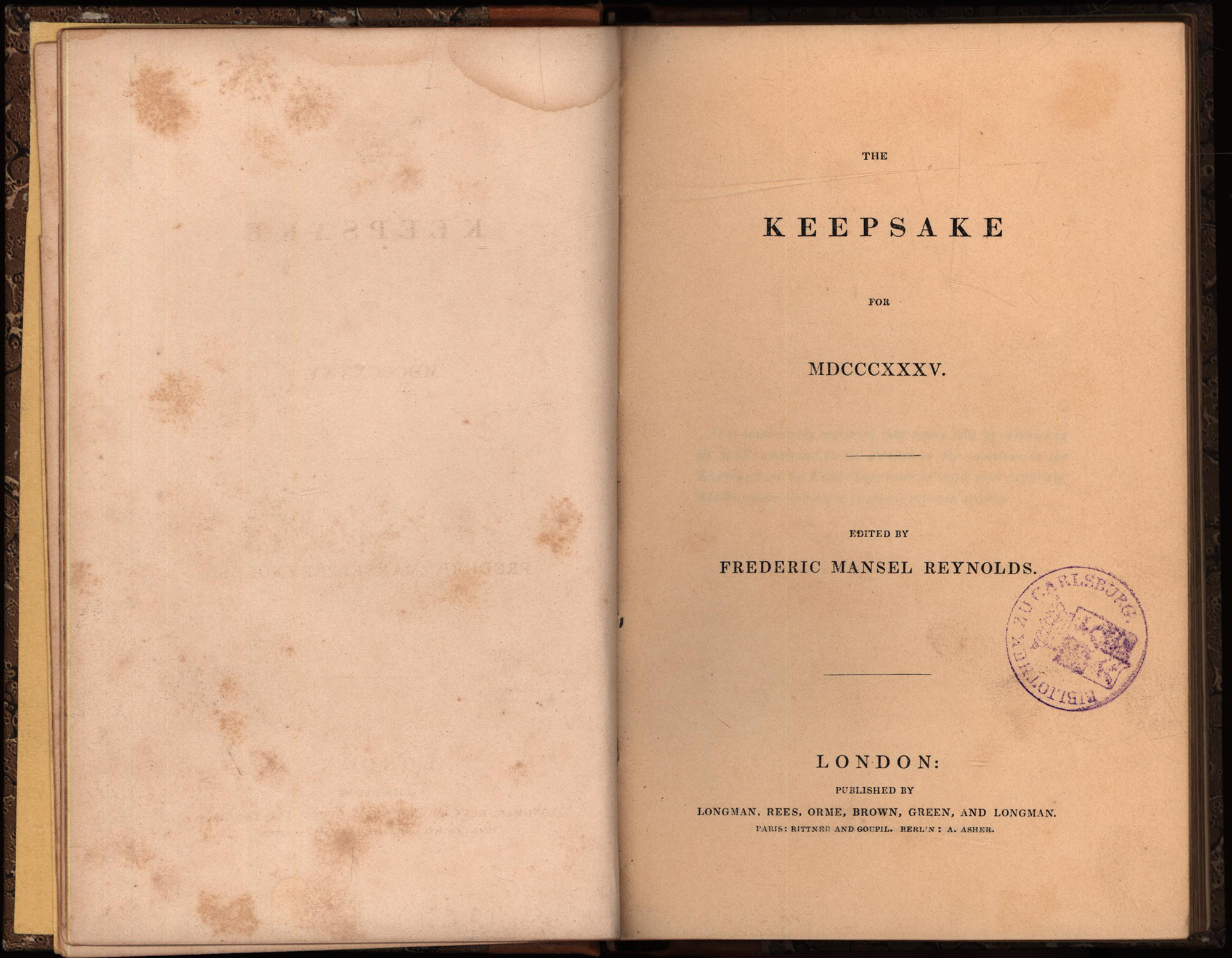 Reynolds, Frederic Mansel (Hrsg.): The keepsake for MDCCCXXXV [1835]. [Handeinband]. London, Longman, Rees, Orme, Brown, Green, and Longman Verlag, 1834. 8°. 19,5 x 13 cm. V Seiten, [1] Blatt, 296 Seiten. 17 Tafeln. Handeinband im Stil der Zeit in Halbleder mit marmoriertem Deckelbezug und Rundum-Goldschnitt.