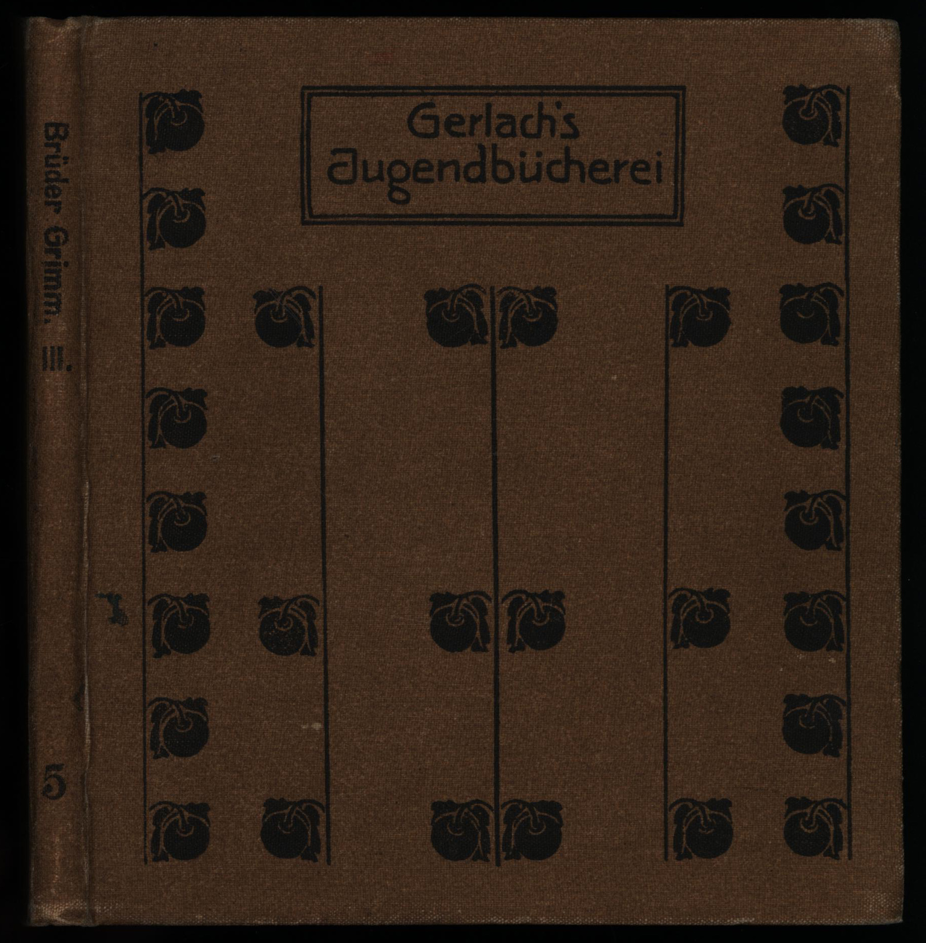Grimm, Jacob und Grimm, Wilhelm: Kinder- und Hausmärchen aus der Sammlung der Brüder Grimm. Bilder von Karl Fahringer. Texte gesichtet von Hans Fraungruber. Wien/Leipzig, Verlag von Martin Gerlach, 1902. Klein-8°. 15,5 x 14 cm. 94 Seiten. Original-Leinenband mit Deckelillustration, illustrierten Vorsätzen (Dämonenfratze) und Rundum-Orangeschnitt. (= Gerlach’s Jugendbücherei, Band 5).
