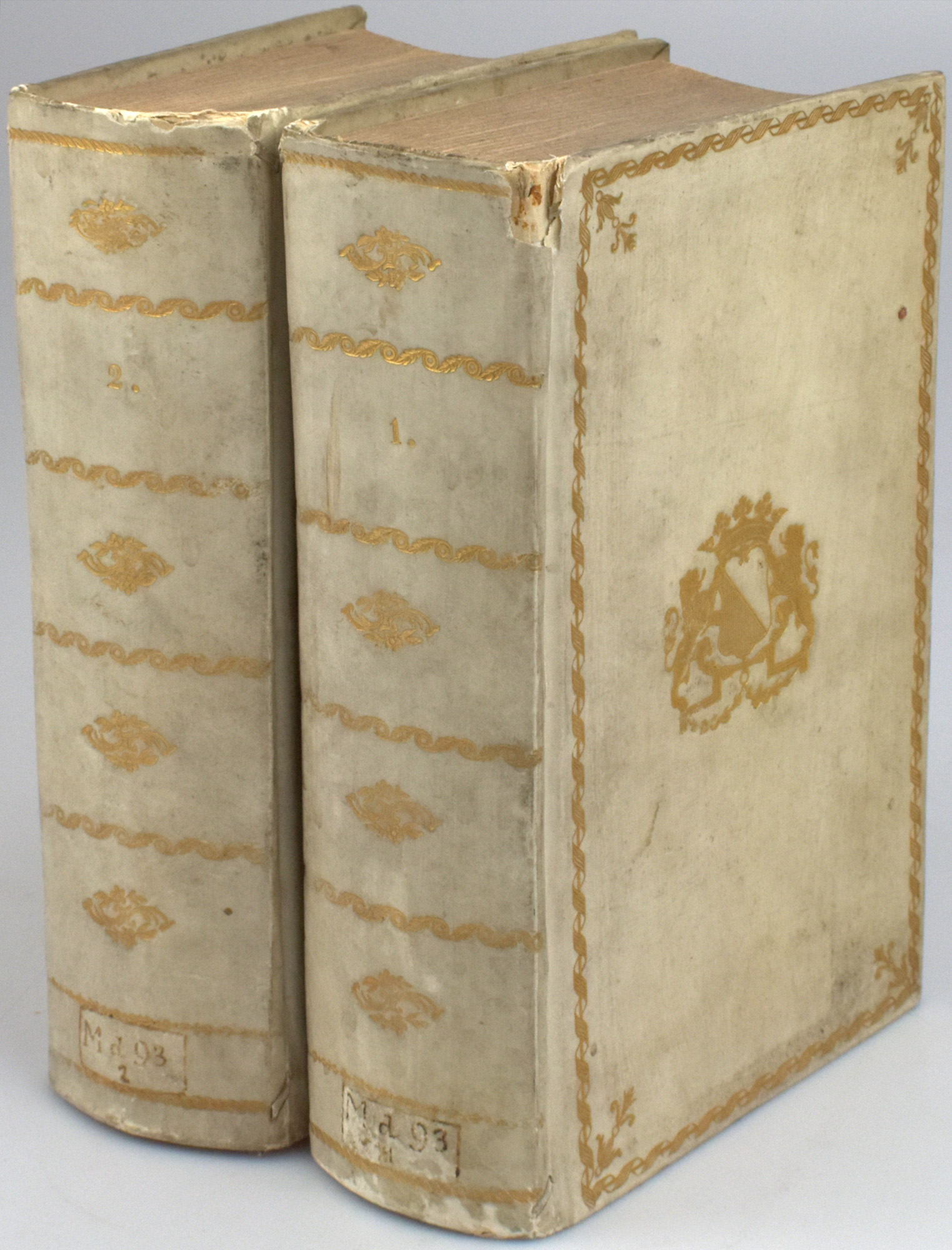 Vellum bindings of the period with gilt armorial supralibros, gilt fillet decoration, and blue sprinkled edges. First edition with the notes by Georg Heinrich Walther. Latin edition. Contains: (1/2) Annales; (3) Historiae; (4) Opera Minora. Bindings somewhat rubbed at the edges and joints. Library stamp of the Hamburger Christianeum on the title-page, and library shelfmark in ink on front endpaper and spine. Pages lightly to moderately foxed. Overall near fine copy.