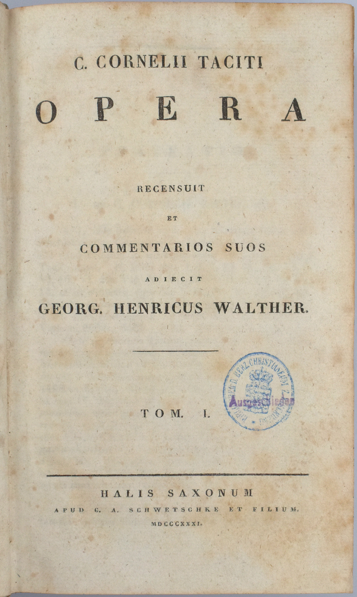 Tacitus, Cornelius – Walther, Georg Heinrich (Bearb.): Opera. Recensuit et ceommentarios suos adiecit Georg. Henricus Walther. 4 Bände (in 2, komplett). Halle, Verlag Carl Gustav Schwetschke, 1831-1833. 8°. 22 x 13,5 cm. XLIV, 432, 463; 524, 483 Seiten. Pergamentbände der Zeit mit goldgeprägtem Wappensupralibros, goldgeprägten Fileten und blauem Sprengschnitt.