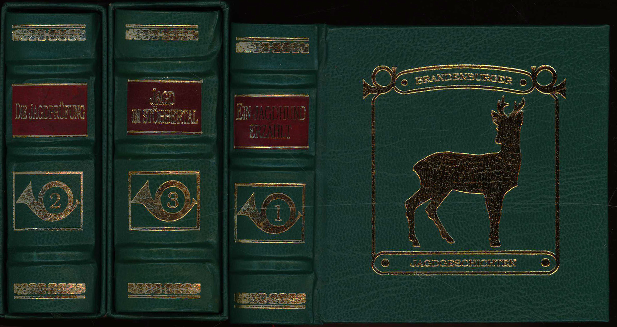 Müller, Heinz: Ein Jagdhund erzählt. Die Abenteuer meines Jagdhundes „Biene von der freien Wildbahn“. Bratislava, Nestor Verlag, 2011. 12°. 10 x 15 cm. 211; 171; 194 Seiten. Grüne Original-Lederbände auf 3 Bünden mit goldgeprägtem Titel auf roten Lederrückenschildern, ornamentaler Rückenvergoldung und Lesebändchen. Original-Lederschuber. (= bibliotheca minilibris, Band 25-27).