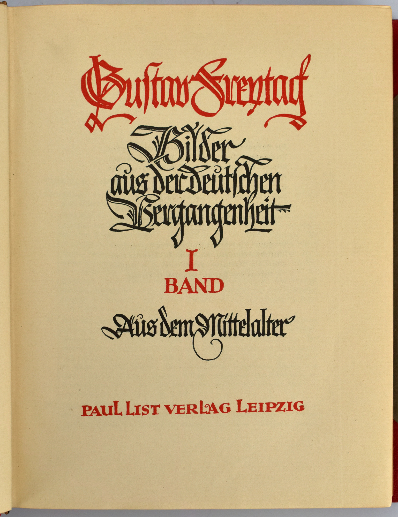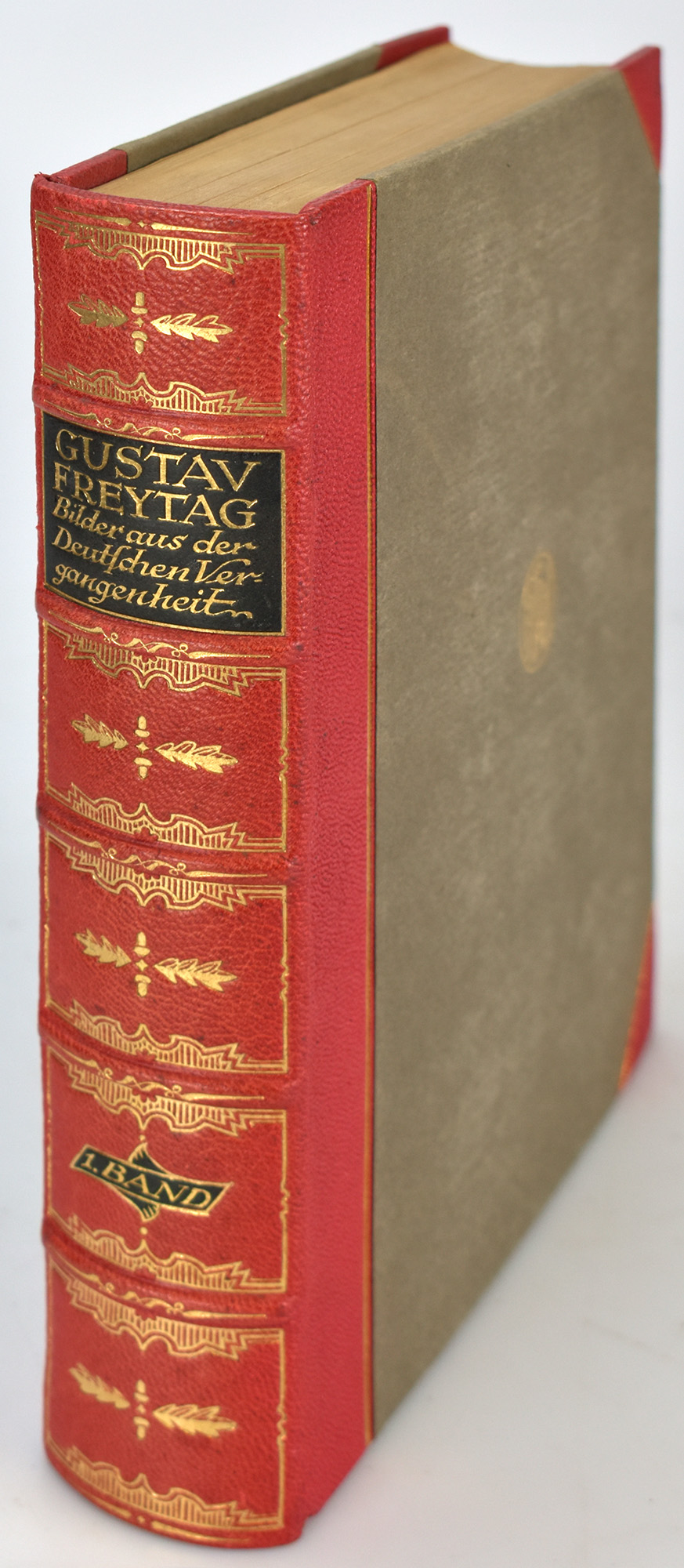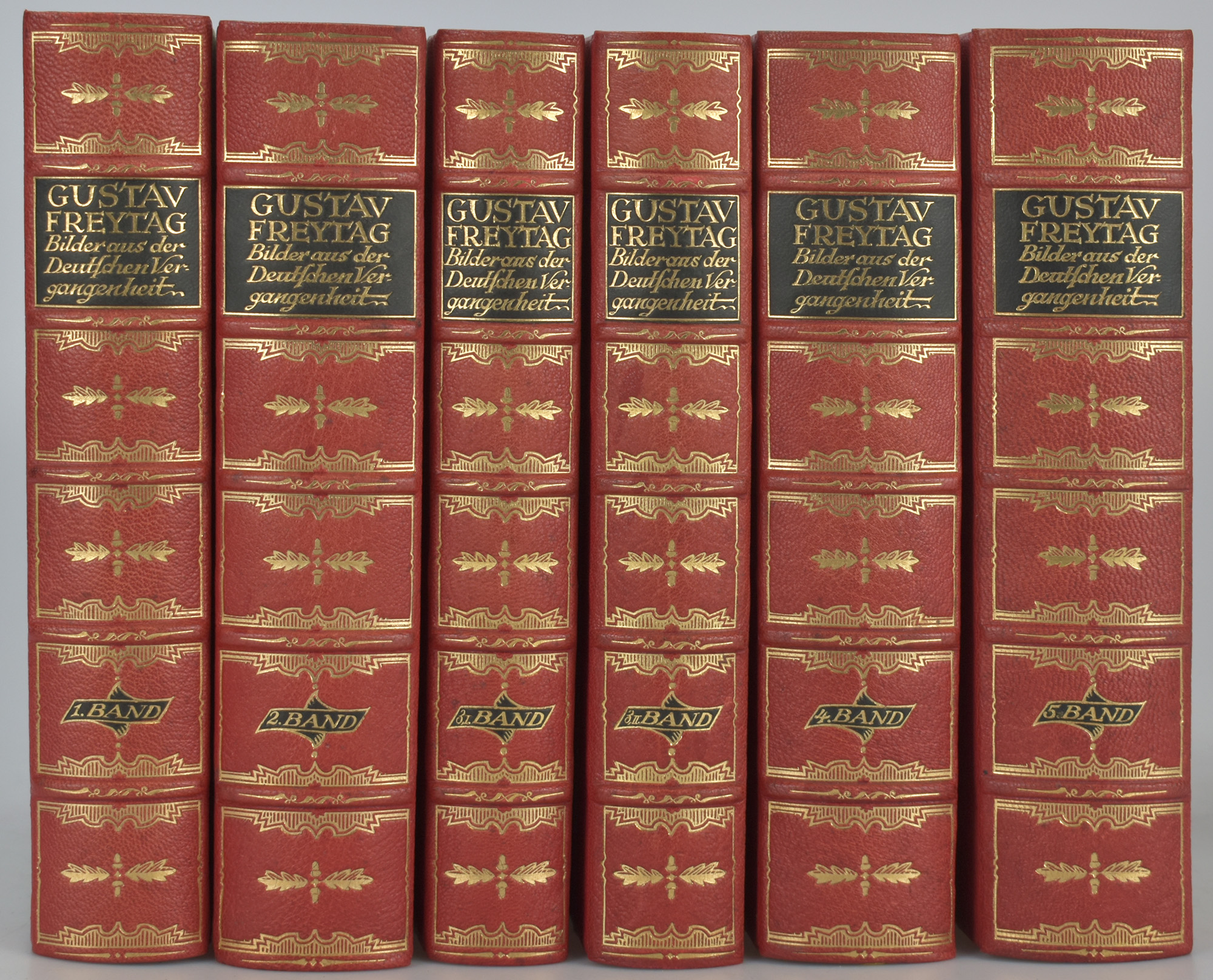 Freytag, Gustav: Bilder aus der deutschen Vergangenheit. Band 1: Aus dem Mittelalter. Band 2: Vom Mittelalter zur Neuzeit. Band 3/I und Band 3/II: Aus dem Jahrhundert der Reformation. Band 4: Aus dem Jahrhundert des grossen Krieges. 1600-1700. Band 5: Aus neuer Zeit 1700-1848. 5 Bände in 6 (komplett). Leipzig, Verlag Paul List, 1924. Groß-8°. 23,5 x 18,5 cm. XX, 516; XV, 531; XI, 522 (fortlaufend paginiert); XVI, 455; XVI, 587 Seiten. Rote Original-Halblederbände auf 5 Bünden mit reicher Rückenvergoldung, goldgeprägtem Titel auf schwarzen Lederrückenschildern und goldenem Kopfschnitt.
