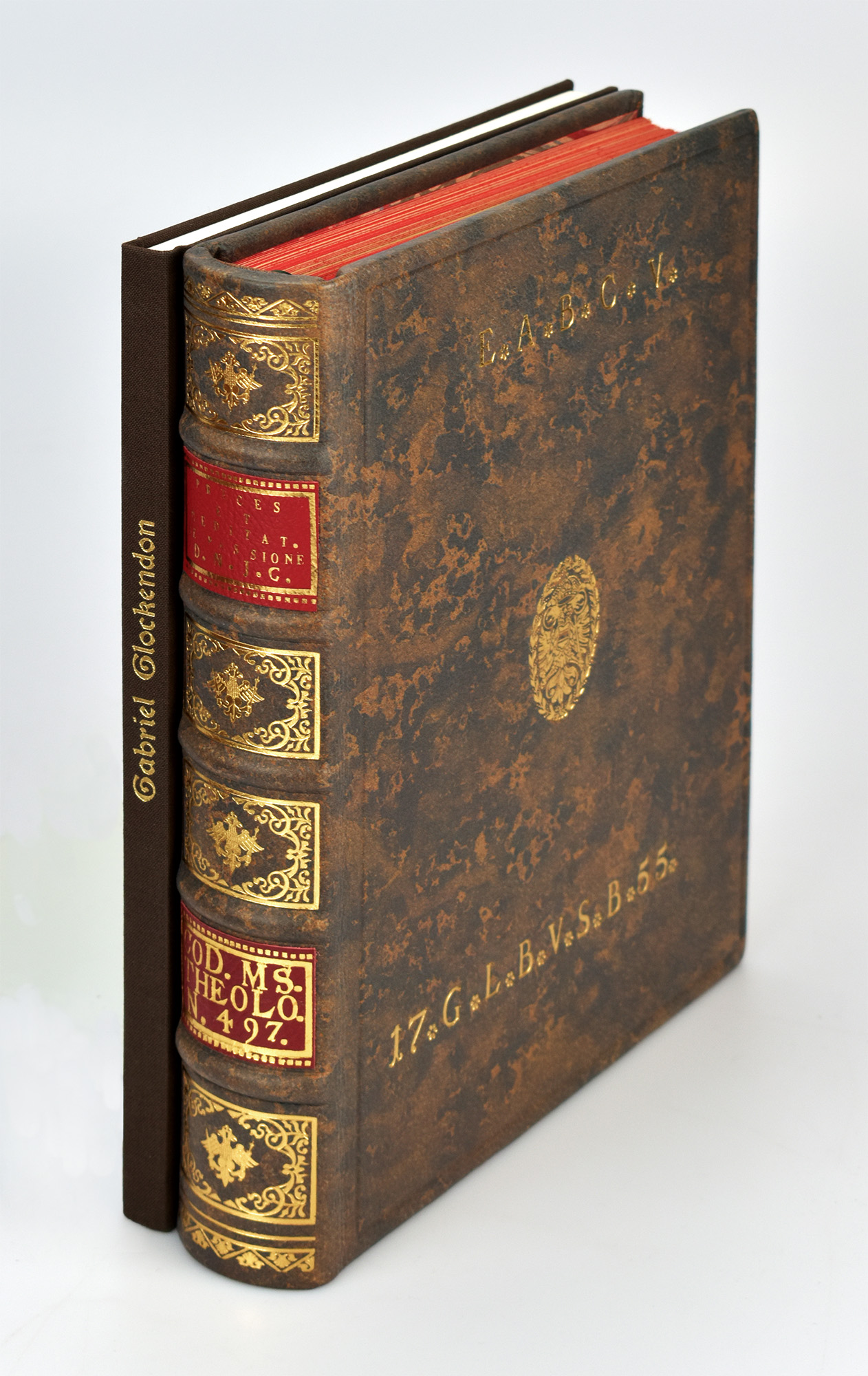 Facsimile volume in original full leather, 5 raised bands, with red leather spine labels, ornamental gilt tooling on the spine, gilt supralibros, and red edges. Commentary volume in original full cloth with gilt titles. Both housed in a leather slipcase with a mounted, gilt medallion on the cover. Number 46 of 99 copies of the luxury edition from the sub-edition Bibliotheca Rara.