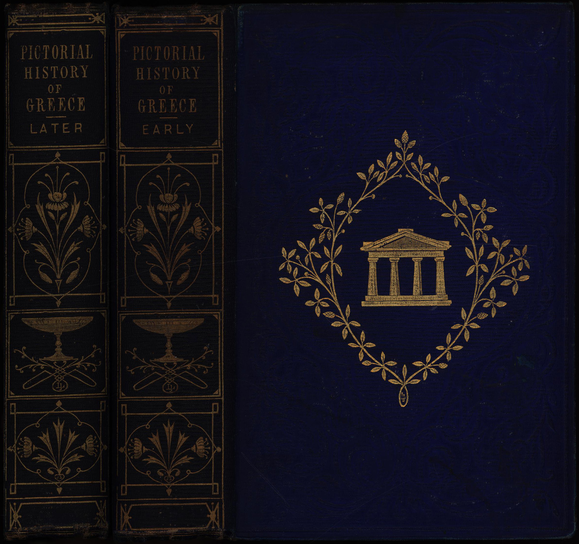 Lyall, William Roe (u.a.): The pictorial history of Greece. Band 1: Mythology and early history. Band 2: History of Greece, Macedonia, and Syria. 2 Bände (komplett). London/Glasgow, Verlag Richard Griffin, [um 1860]. 8°. 19 x 13 cm. XII, 536; XV, 462 Seiten. Blaue Pappeinbände der Zeit mit reicher Blind- und Goldprägung und Rundum-Goldschnitt.