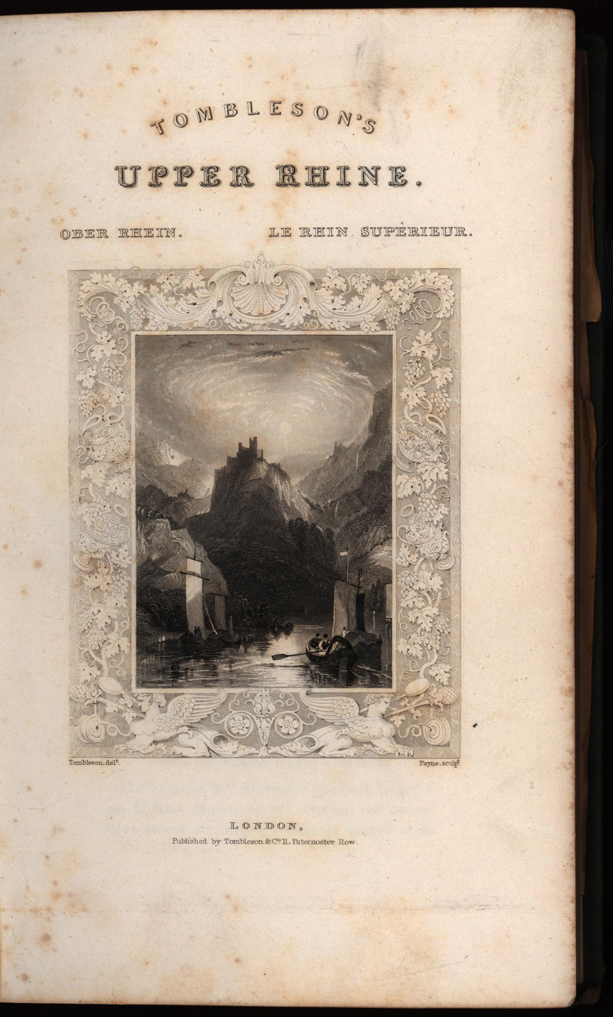Tombleson, William: Tombleson’s Upper Rhine. Ober Rhein. Le Rhin Superieur. London, Tombleson Verlag, [um 1840]. 4°. 27 x 20,5 cm. VIII, 181 Seiten, [1] Blatt. Leinenband der Zeit mit goldgeprägtem Rückentitel, reicher floraler Blindprägung und Rundum-Goldschnitt.