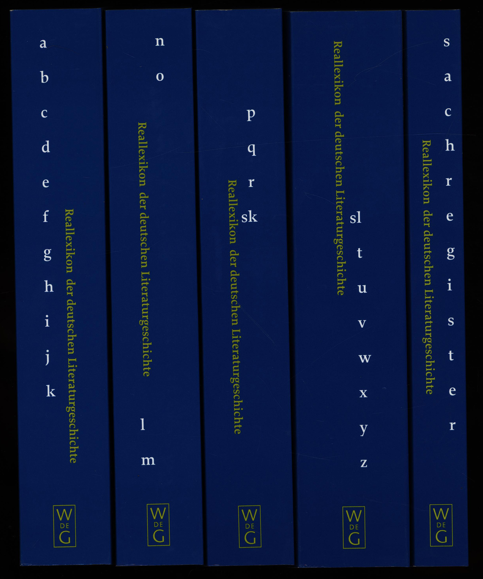 Reallexikon der deutschen Literaturgeschichte. 5 Bände (4 Hauptbände und Registerband, komplett). Berlin [u.a.], de Gruyter Verlag, 2001. Groß-8°. 24 x 17 cm. XVI, 915; 874; 873; 1120; 510 Seiten. Original-Broschuren.