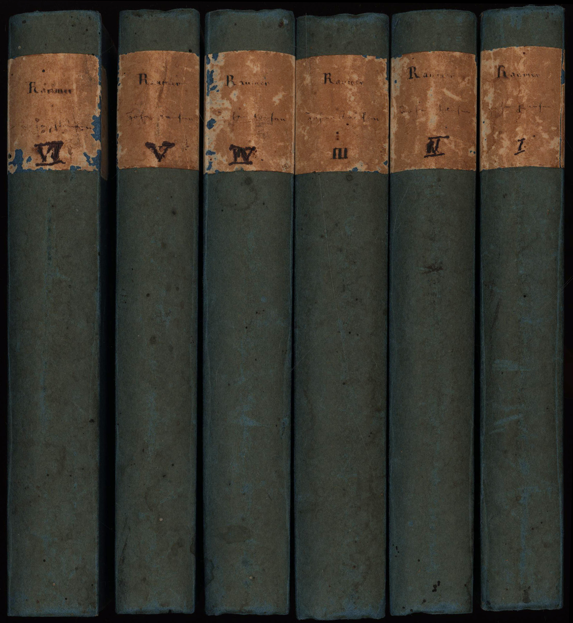 Raumer, Friedrich von: Geschichte der Hohenstaufen und ihrer Zeit. 6 Bände (komplett). Reutlingen, Enßlin Verlag, 1828-1829. 8°. 20,5 x 14 cm. XVIII, 509; X, 517; X, 652; VIII, 591; XIV, 463; XVI, 559 Seiten. Pappbände der Zeit mit handbetiteltem Papierrückenschild.