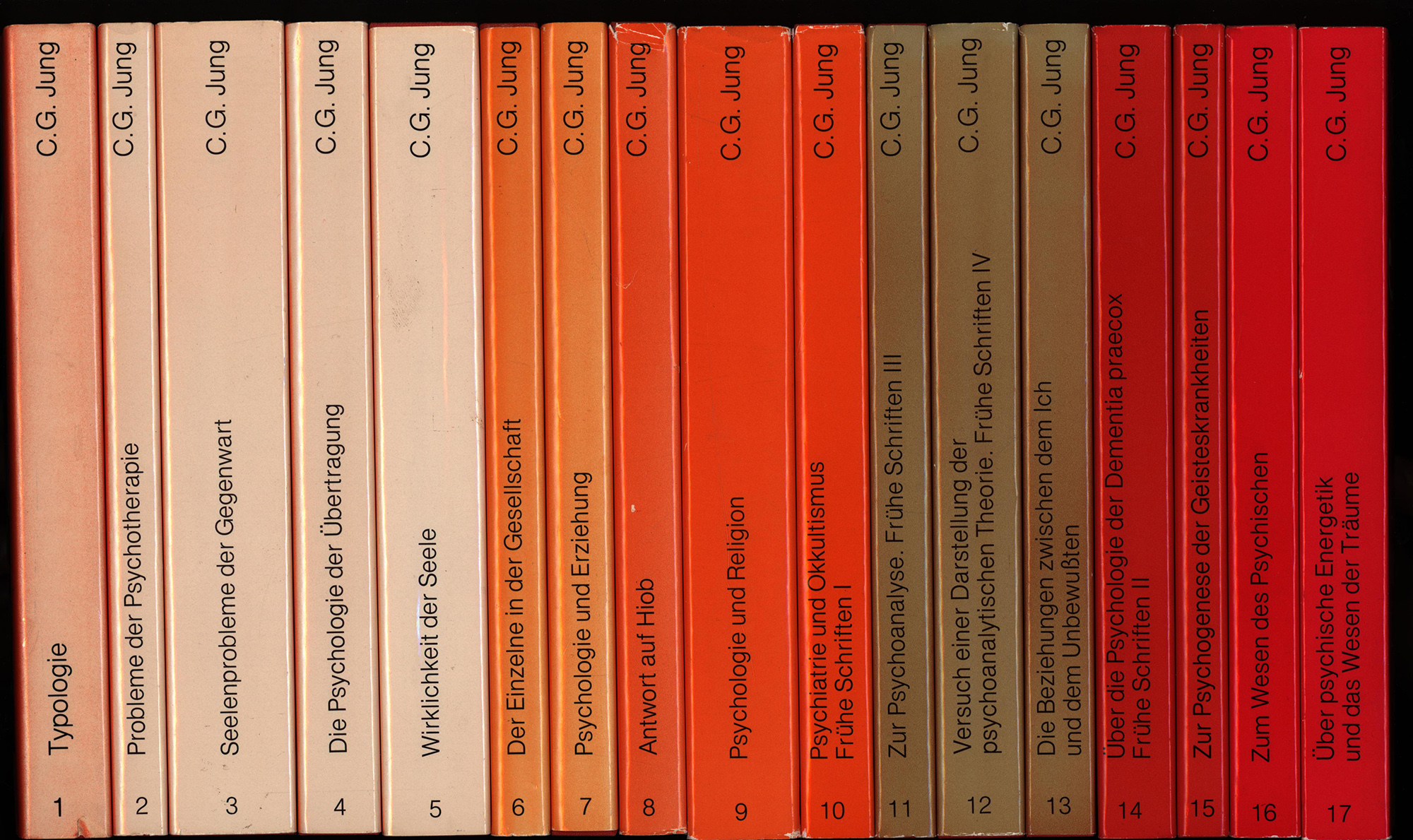 Sonderausgabe für die Wissenschaftliche Buchgesellschaft. Darin die Bände 1) Typologie. 2) Problem der Psychotherapie. 3) Seelenprobleme der Gegenwart. 4) Die Psychologie der Übertragung. 5) Wirklichkeit der Seele. 6) Der Einzelne in der Gesellschaft. 7) Psychologie und Erziehung. 8) Antwort auf Hiob. 9) Psychologie und Religion. 10) Psychiatrie und Okkultismus. Frühe Schriften I. 11) Zur Psychoanalyse. Frühe Schriften III. 12) Versuch einer Darstellung der psychoanalytischen Theorie. Frühe Schriften IV. 13) Die Beziehungen zwischen dem Ich und dem Unbewußten. 14) Über die Psychologie der Dementia praecox. Frühe Schriften II. 15) Zur Psychogenese der Geisteskrankheit. 16) Zum Wesen des Psychischem. 17) Über psychische Energetik und das Wesen der Träume. Schutzumschläge an den Rücken leicht bis stark aufgehellt, ansonsten gutes bis sehr gutes Exemplar.