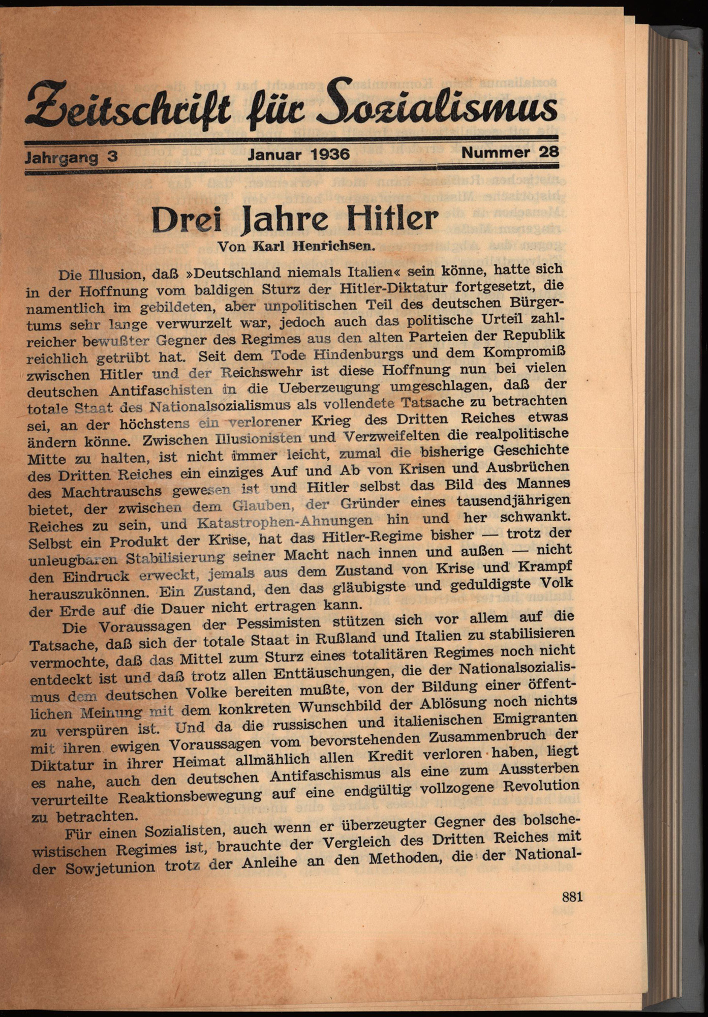 Sattler, Ernst (Hsrg.): Zeitschrift für Socialismus. Jahrgang 3, Nummer 28-36, Januar-September. 8 Nummern (in einem Band, darunter eine Doppelnummer). Karlsbad, 1936. Groß-8°. 23,5 x 15,5 cm. Seiten 881-1135. Privater Leinenband.