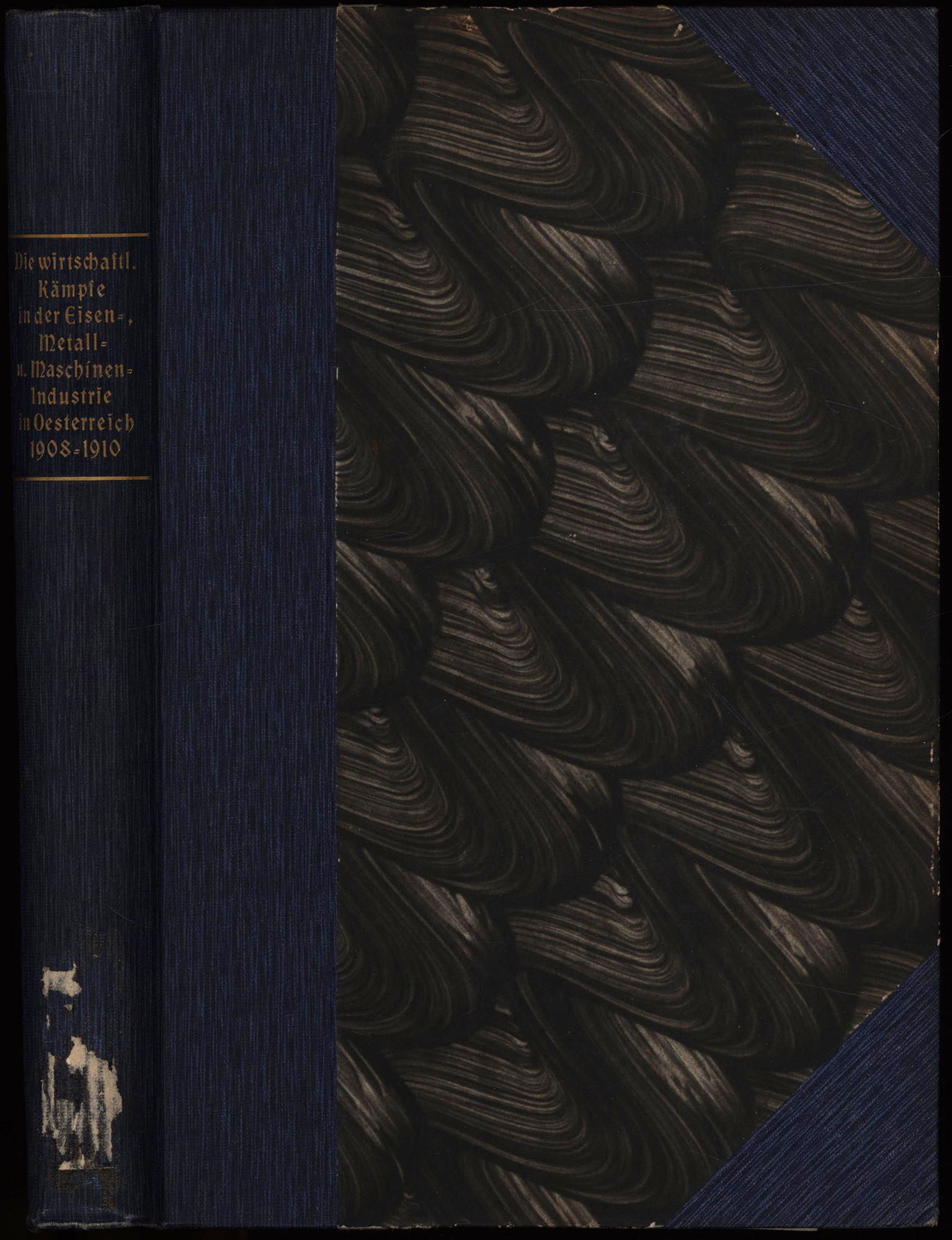 Die wirtschaftlichen Kämpfe in der Eisen-, Metall- und Maschinenindustrie in Oesterreich. Statistik der Streiks, Aussperrungen und Bewegungen ohne Einstellung der Arbeit sowie der abgeschlossene Tarifverträge von 1908 bis 1910. Wien, Verlag Oesterreichischer Metallarbeiterverband, 1911. Groß-8°. 23,5 x 16,5 cm. 464 Seiten. Privater Halbleinenband mit marmoriertem Deckelbezug, illustrierten Vorsätzen und Rundum-Blauschnitt.