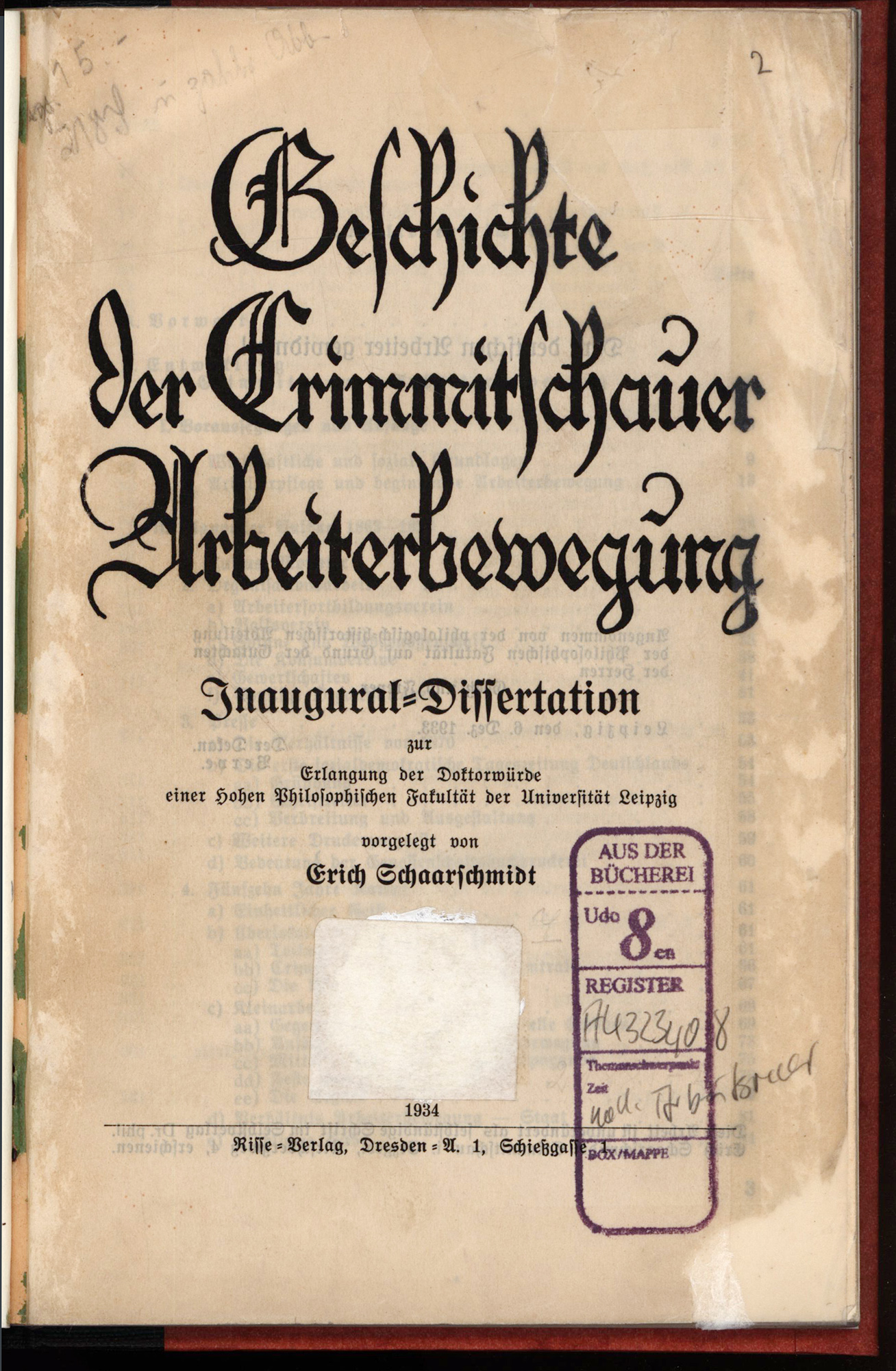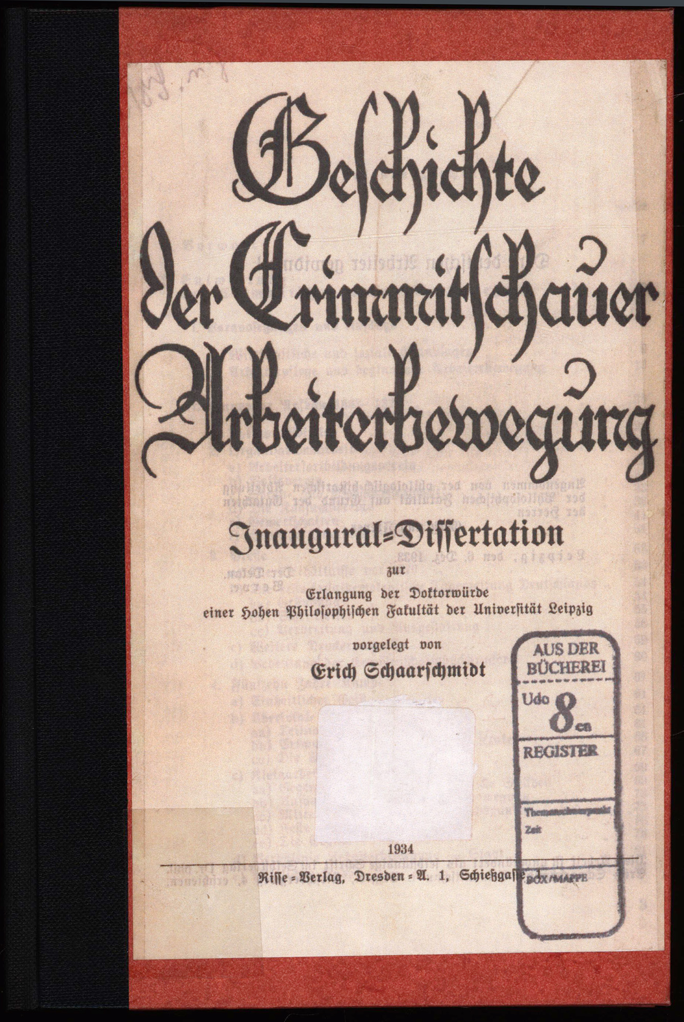 Schaarschmidt, Erich: Geschichte der Crimmitschauer Arbeiterbewegung. Crimmitschau, Selbstverlag, 1934. Groß-8°. 23 x 15,5 cm. 218 Seiten. Privater Einband in kaschiertem Halbleinen mit aufkaschierter Original-Broschur.