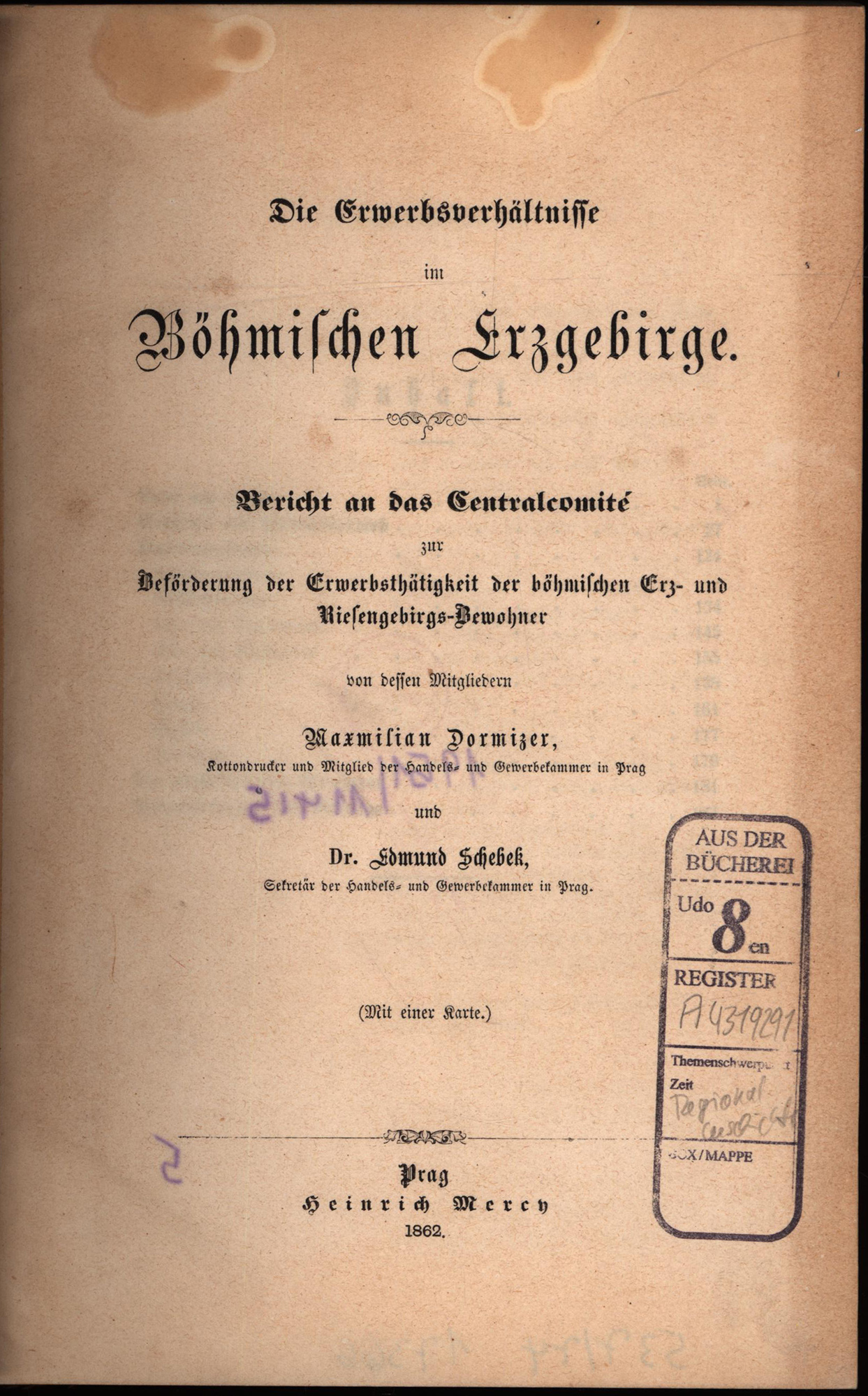 Dormizer, Maximilian und Schebek, Edmund: Die Erwerbsverhältnisse im Böhmischen Erzgebirge. Bericht an das Centralcomité zur Beförderung der Erwerbsthätigkeit der böhmischen Erz- und Riesengebirgs-Bewohner. Prag, Mercy Verlag, 1862. 8°. 22,5 x 15 cm. [4] Blatt, 231 Seiten. Privater Einband mit Rücken aus Gewebeband, Pappdeckeln und aufkaschiertem Deckelschild.