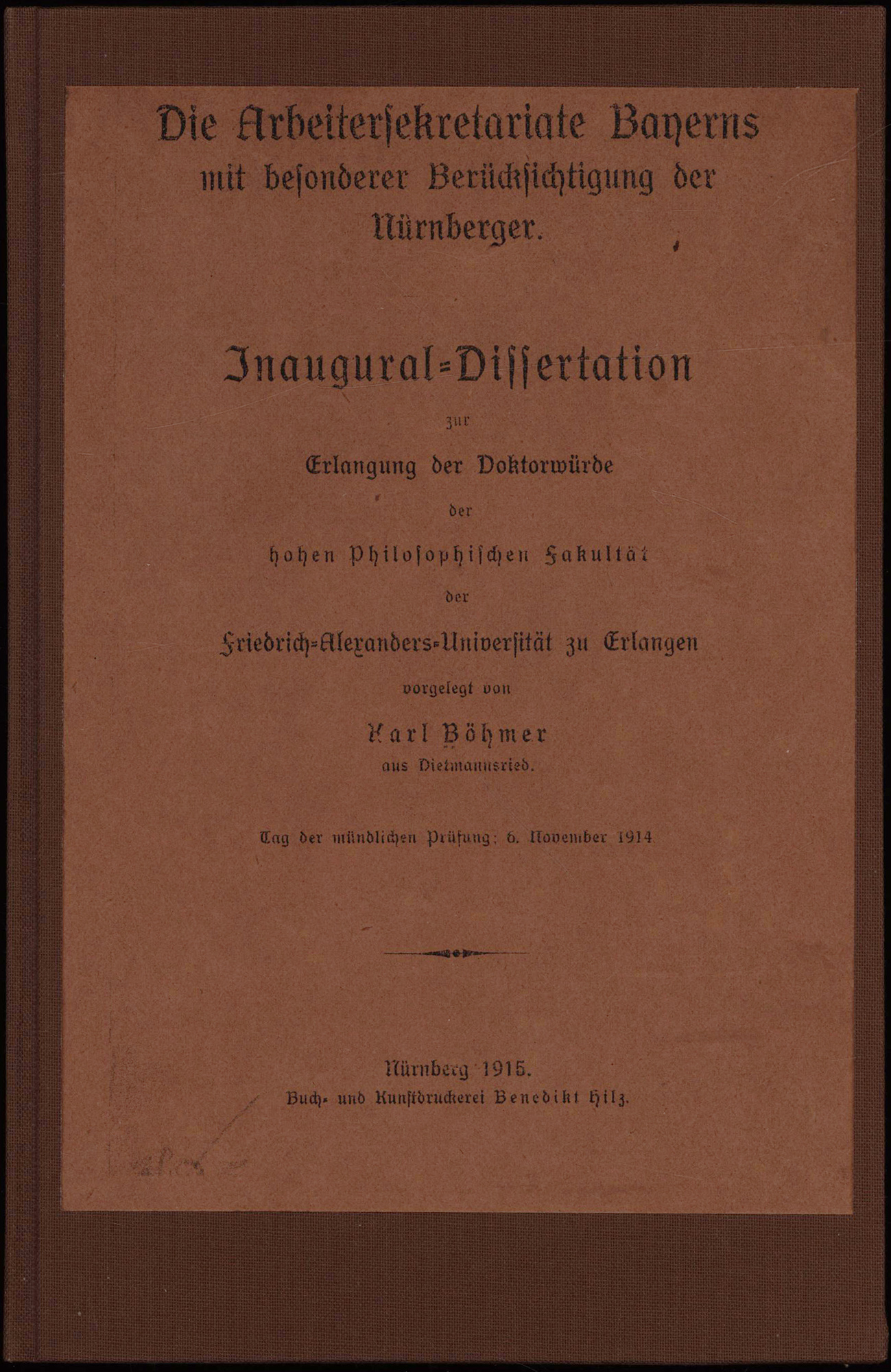 Böhmer, Karl: Die Arbeitersekretariate Bayerns mit besonderer Berücksichtigung der Nürnberger. Inaugural-Dissertation zur Erlangung der Doktorwürde der hohen Philosophischen Fakultät der Friedrich-Alexanders-Universität zu Erlangen. Nürnberg, Verlag Benedikt Hilz, 1915. 8°. 22,5 x 15 cm. VI, 116 Seiten. Privater Leinenband mit aufkaschierter Original-Broschur.