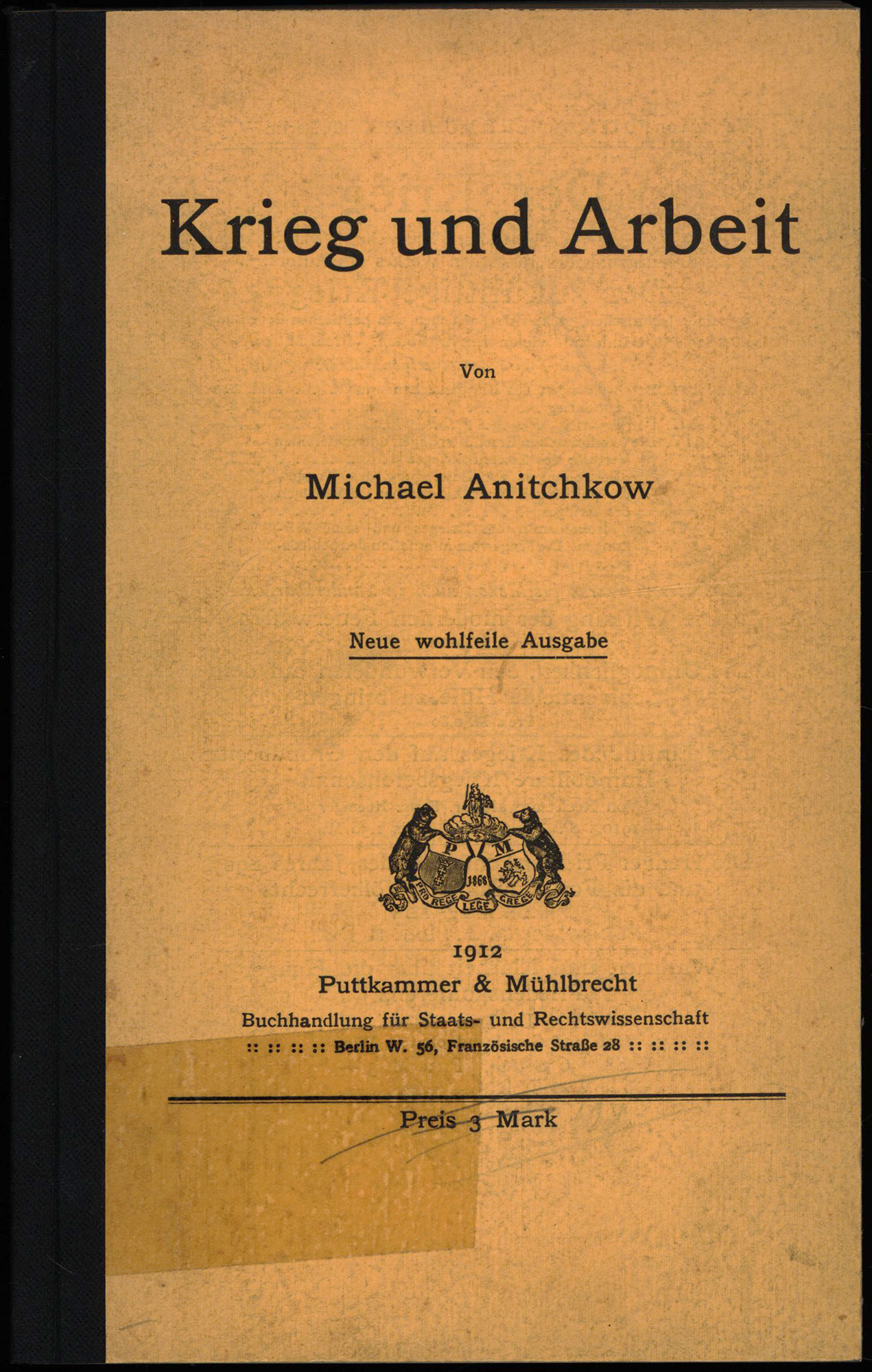 Anitchkow [Anickov], Michael: Krieg und Arbeit. Berlin, Verlag Puttkammer & Mühlbrecht, 1912. Groß-8°. 23,5 x 15 cm. XI, 604 Seiten. Bibliothekseinband in Buckram mit aufkaschierter Original-Broschur auf Vorderdeckel.