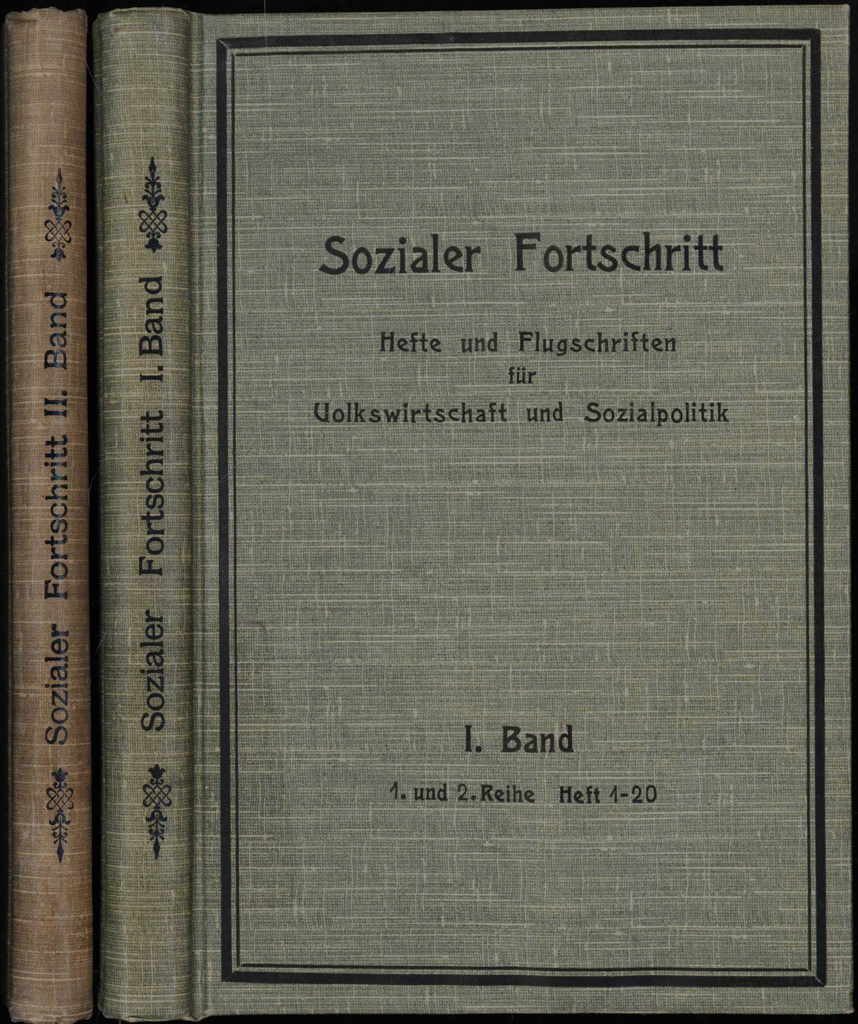 Sozialer Fortschritt. Hefte und Flugschriften für Volkswirtschaft und Sozialpolitik. I. Band. 1. und 2. Reihe (Heft 1-20). Band II: 3. und 4. Reihe (Heft 21-40). 40 Hefte in 2 Bänden. Leipzig, Verlag Felix Dietrich, [1904]. 8°. 21,5 x 14,5 cm. Insgesamt ca. 650 Seiten. Leinenbände der Zeit mit schwarzgeprägtem Deckeltitel, floralem Vorsatzpapier und marmoriertem Schnitt.