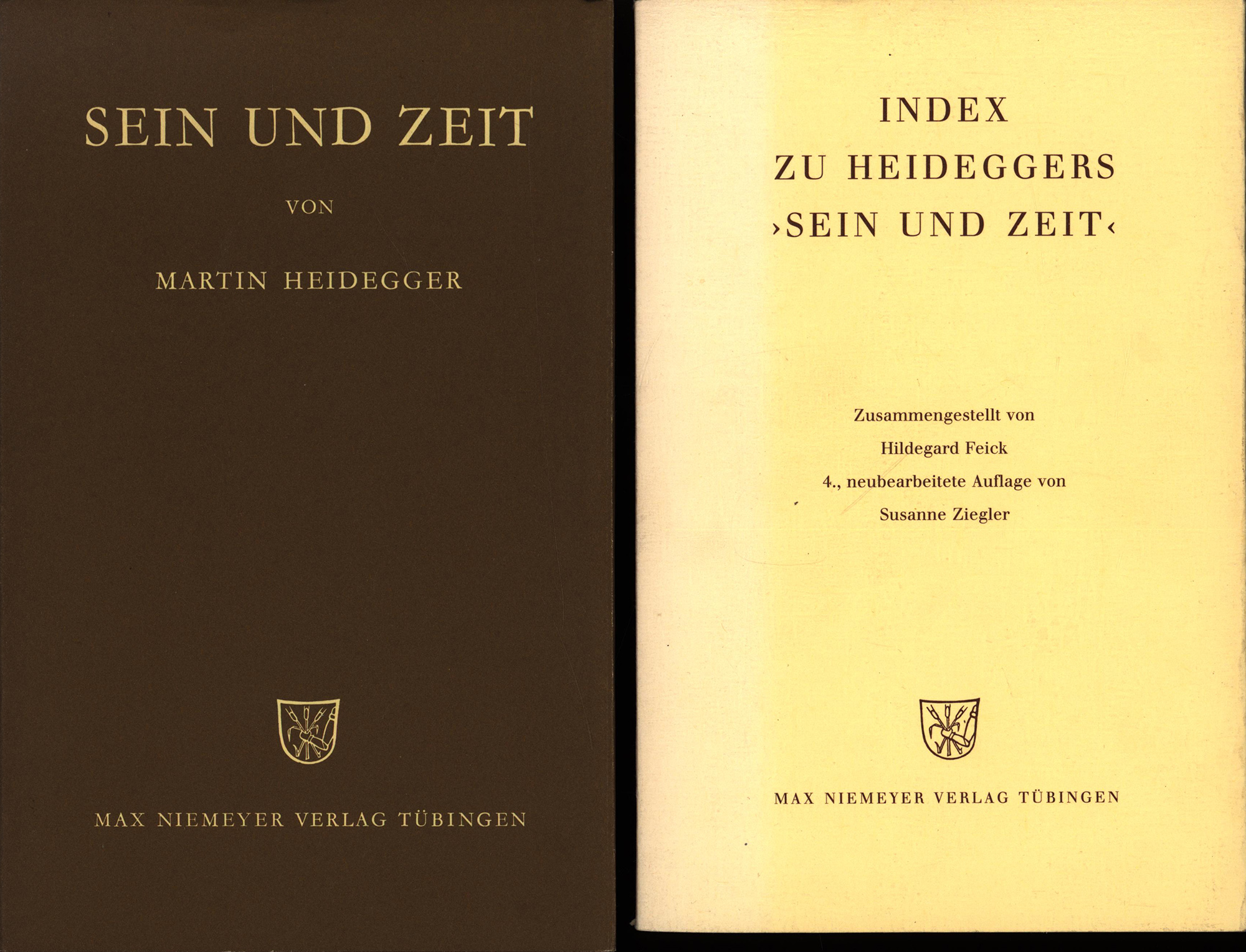 Heidegger, Martin: Sein und Zeit. Siebzehnte Auflage. / Index zu Heideggers ‚Sein und Zeit‘. 4., neubearbeitete Auflage. 2 Bände. Tübingen, Max Niemeyer Verlag, 1993/1991. 8°. 22,5 x 14 cm. XIII, 445 Seiten. 138 Seiten Indexband. Original-Leinenband mit Original-Schutzumschlag. Indexband Original-Broschur.