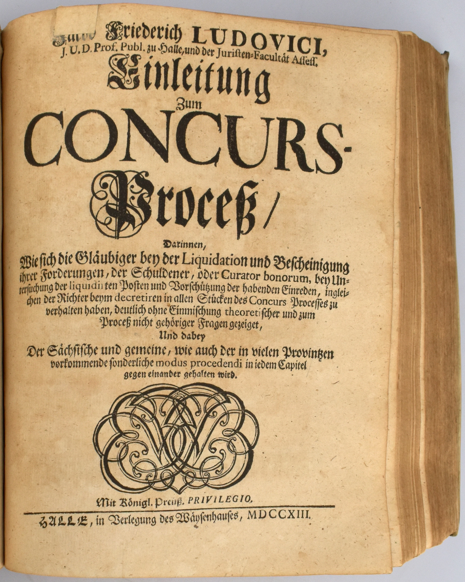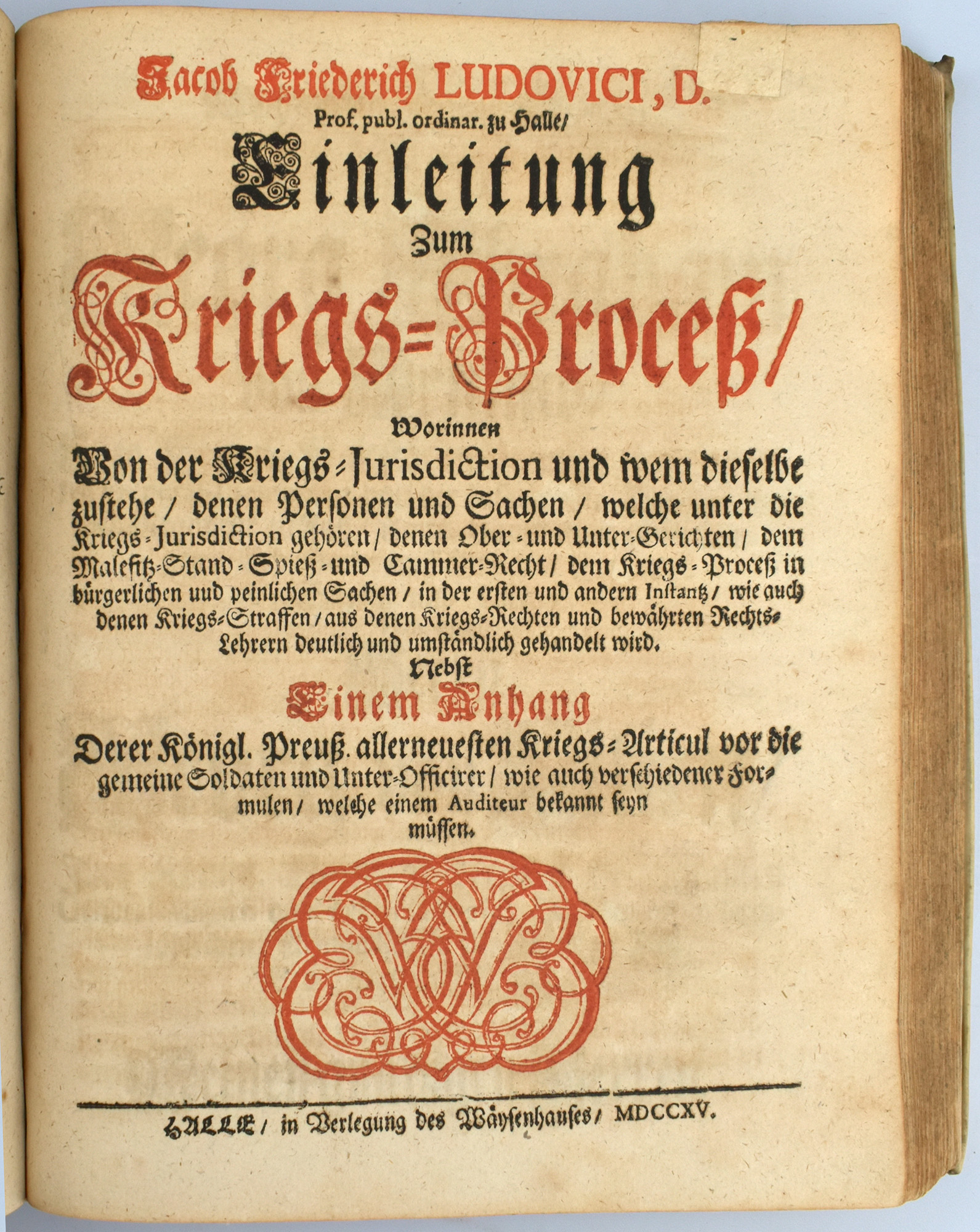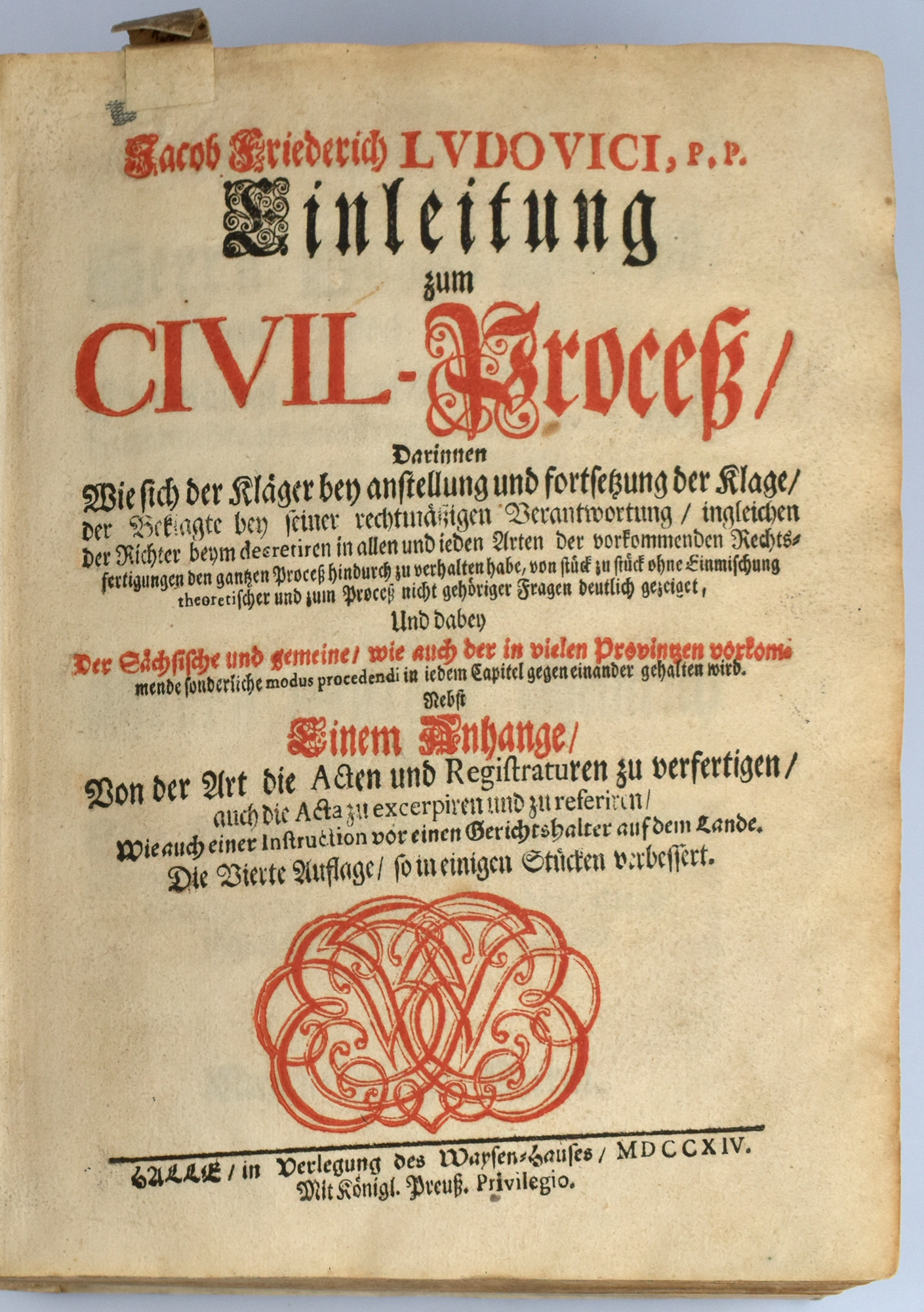 Stintzing-Landsberg III/1, 136. Enthält die folgenden Werke aus der weithin verbreiteten ‚Einleitungen’-Sammlung des Juristen und Hofrats Jakob Friedrich Ludovici (1661-1723), deren Texte zum Großteil während seiner Hallenser Lehrtätigkeit verfasst wurden: 1) Einleitung zum Civil-Prozeß. 4., verbesserte Auflage. Halle, 1714. 15 Blatt, 384 Seiten. Mit Titelblatt in Rot und Schwarz, gestochenem Porträt-Frontispiz und Holzschnittvignetten. 2) Einleitung zum Consistorial-Proceß. 1. Auflage. Halle, 1713. [8] Blatt, 182 Seiten, [8] Blatt. Mit Holzschnittvignetten. 3) Einleitung zum Wechsel-Proceß. 2. Auflage. Halle, 1713. [8] Blatt, 238 Seiten, [11] Blatt. Mit in Rot und Schwarz gedrucktem Titelblatt und Holzschnittvignetten. 4) Einleitung zum Concurs-Proceß. 1. Auflage. Halle, 1713. [6] Blatt, 103 Seiten, [4] Blatt. 5) Einleitung zum Peinlichen Proceß. 4. Auflage. Halle, 1714. [6] Blatt, 160 Seiten. Mit Holzschnittvignetten. 6) Einleitung zum Kriegs-Proceß. Halle, 1715. 1. Auflage. [10] Blatt, 220 Seiten, [8] Blatt. Mit in Rot und Schwarz gedrucktem Titelblatt und Holzschnittvignetten. Exemplar aus dem Besitz der Familie von Nitzschwitz.