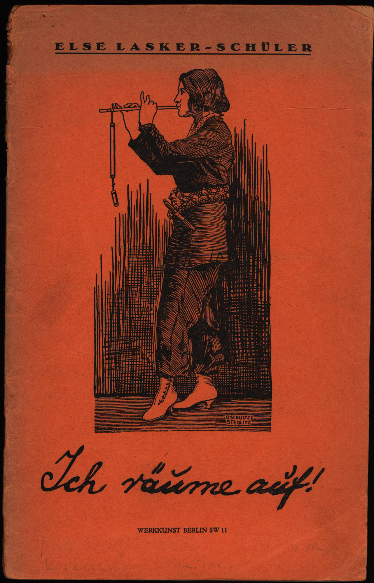 Lasker-Schüler, Else: Ich räume auf! Meine Anklage gegen meine Verleger. Zürich, Lago-Verlag, 1925. 8°. 22 x 14 cm. 38 Seiten, [1] Blatt. Klammergeheftete Original-Broschur mit Deckelillustration in Schwarz-Weiß (Else Lasker-Schüler als Flötenspielerin nach G. Schultze).