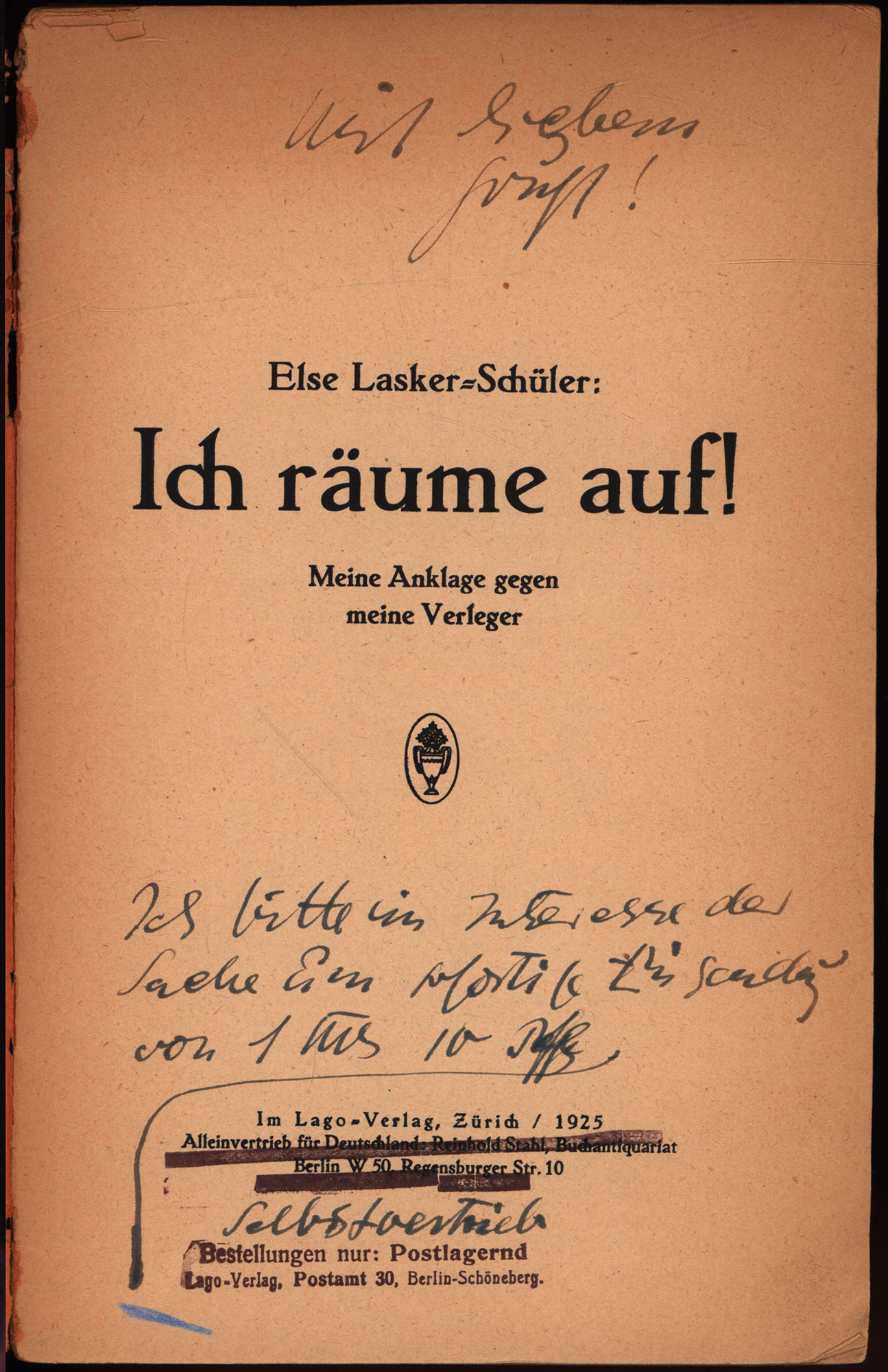 Erste Ausgabe. Wilpert-Gühring 18. Raabe 182, 16. Auf dem Titel findet sich eine eigenhändige Widmung der Autorin in Tinte („Mit liebem Gruß!“), ergänzt durch ihre handschriftliche Aufforderung: „Ich bitte im Interesse der Sache um sofortige Einsendung von 1 Mk 10 Pfge“. Der gedruckte Vermerk „Alleinvertrieb für Deutschland: Reinhold Stahl“ wurde gestrichen und durch einen Stempel ersetzt: „Bestellungen nur: Postlagernd / Lago-Verlag, Postamt 30, Berlin-Schöneberg“, darüber steht ergänzend noch einmal in der Handschrift Else Lasker-Schülers: „Selbstvertrieb“. Berühmte Streitschrift der expressionistischen Dichterin gegen die Verleger Flechtheim und Cassirer, ebenso aber auch gegen Juncker und Wolff.
