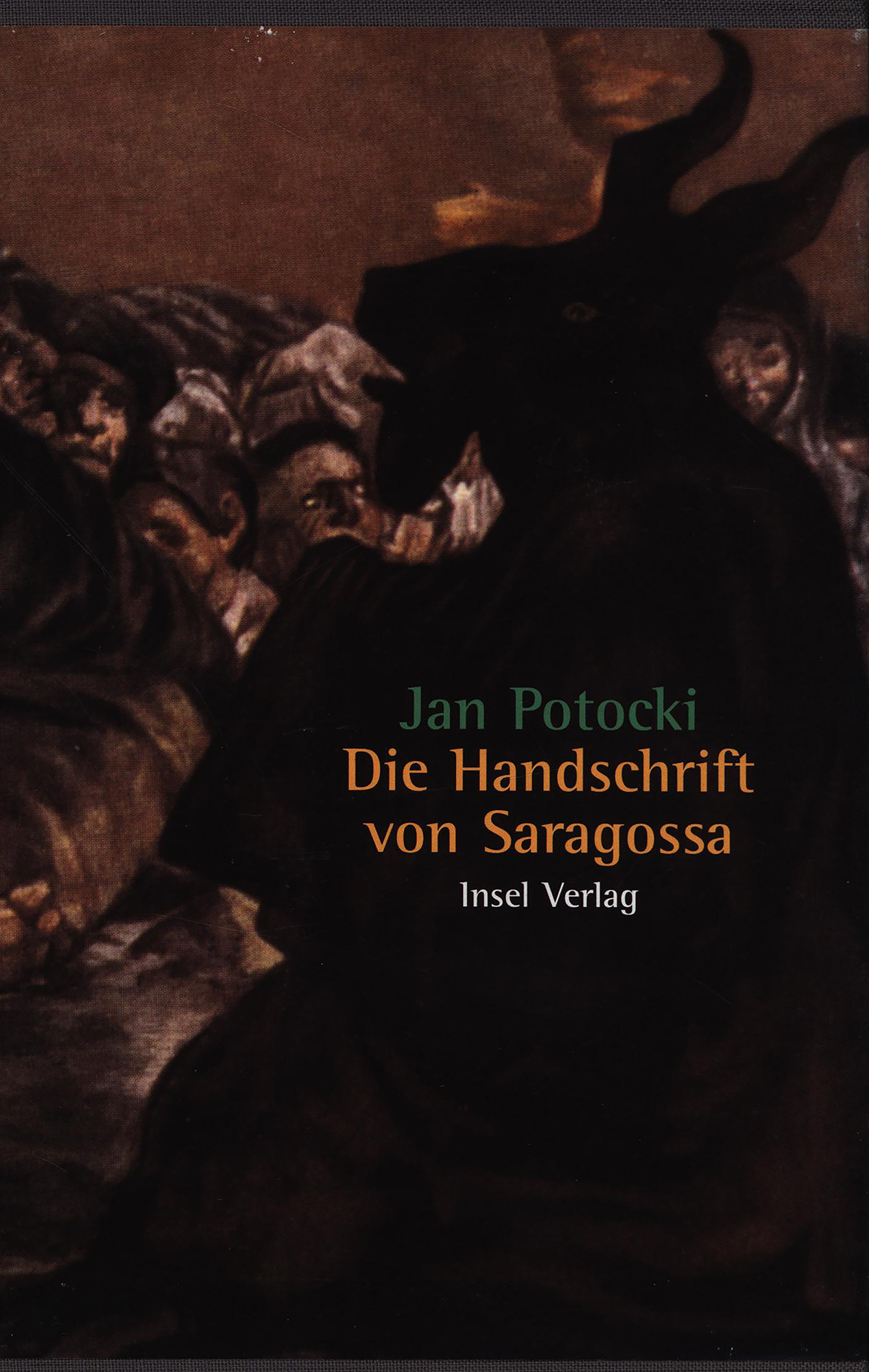 Potocki, Jan: Die Handschrift von Saragossa. Herausgegeben von Roger Caillois. Aus dem Französischen von Louise Eisler-Fischer und aus dem Polnischen von Maryla Reifenberg. Mit einer Auswahl aus Goyas Caprichos. Frankfurt am Main, Insel-Verlag, 1997. 8°. 19 x 13 cm. 876 Seiten. Original-Leinenband mit goldgeprägtem Rückentitel und Original-Klarsichtumschlag im illustrierten Original-Pappschuber. Dünndruckausgabe.