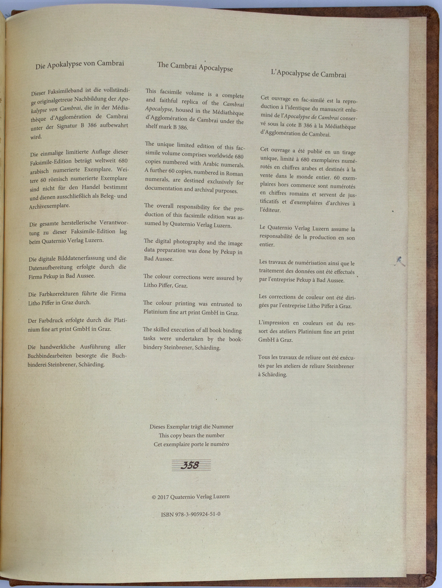 Die Apokalypse von Cambrai. 2 Bände (Faksimile und Kommentarband, komplett). Luzern, Quaternio Verlag, 2017. 4°. 33 x 24,5 cm. 49 Blatt; 232 Seiten. Original-Lederband auf 4 Bünden und Original-Leinenband mit Lesebändchen gemeinsam im Original-Acrylschuber. Die Apokalypse von Cambrai : Ms. B 386, Cambrai, Médiathèque d’Agglomération.